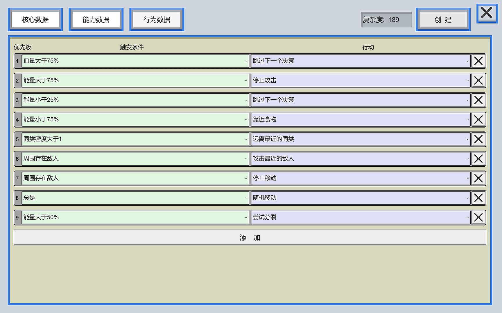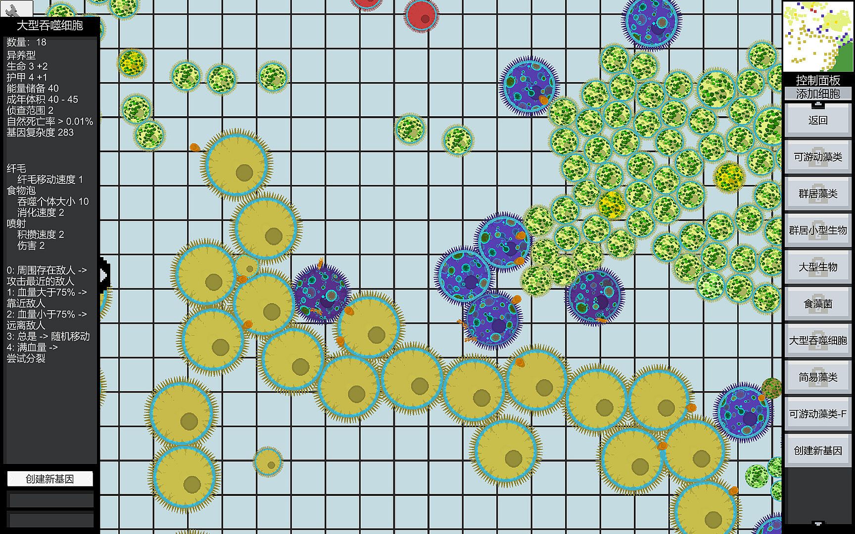 Modify cell attributes: adjust basic properties such as health, energy limits, and pheromones. Add various functions like chloroplasts, phagocytosis, and cilia. Design different behavioral logics to create unique and distinctive cells.