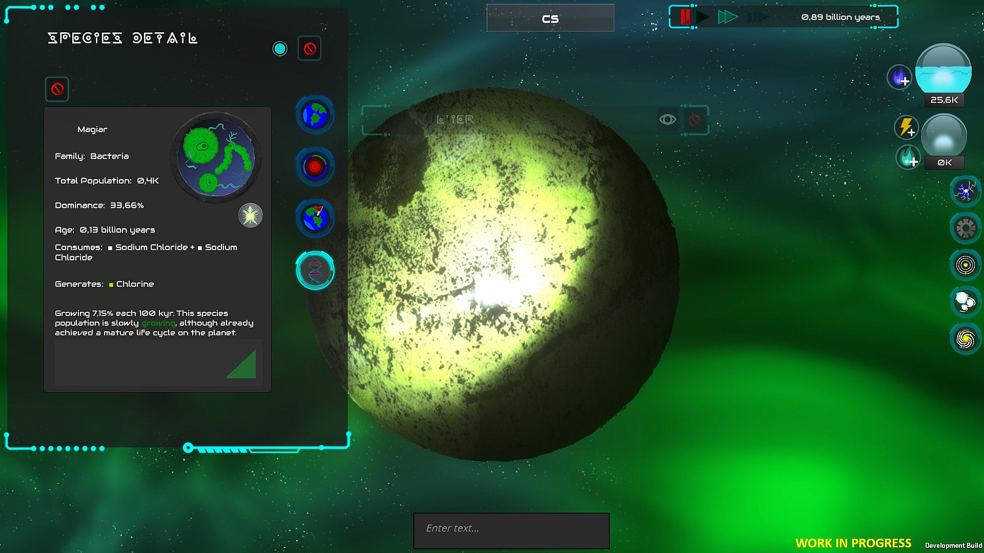Every particle can be combined, to form new molecules with new properties - adding unique features to its host planet. Elements and molecules will melt, solidify or evaporate given the right temperature and circunstances. You can engineer a lush paradisiac world or a toxic burning-hot planet. Creating the perfect environment for life to thrive or the most inhospitable place depends on that right combination.