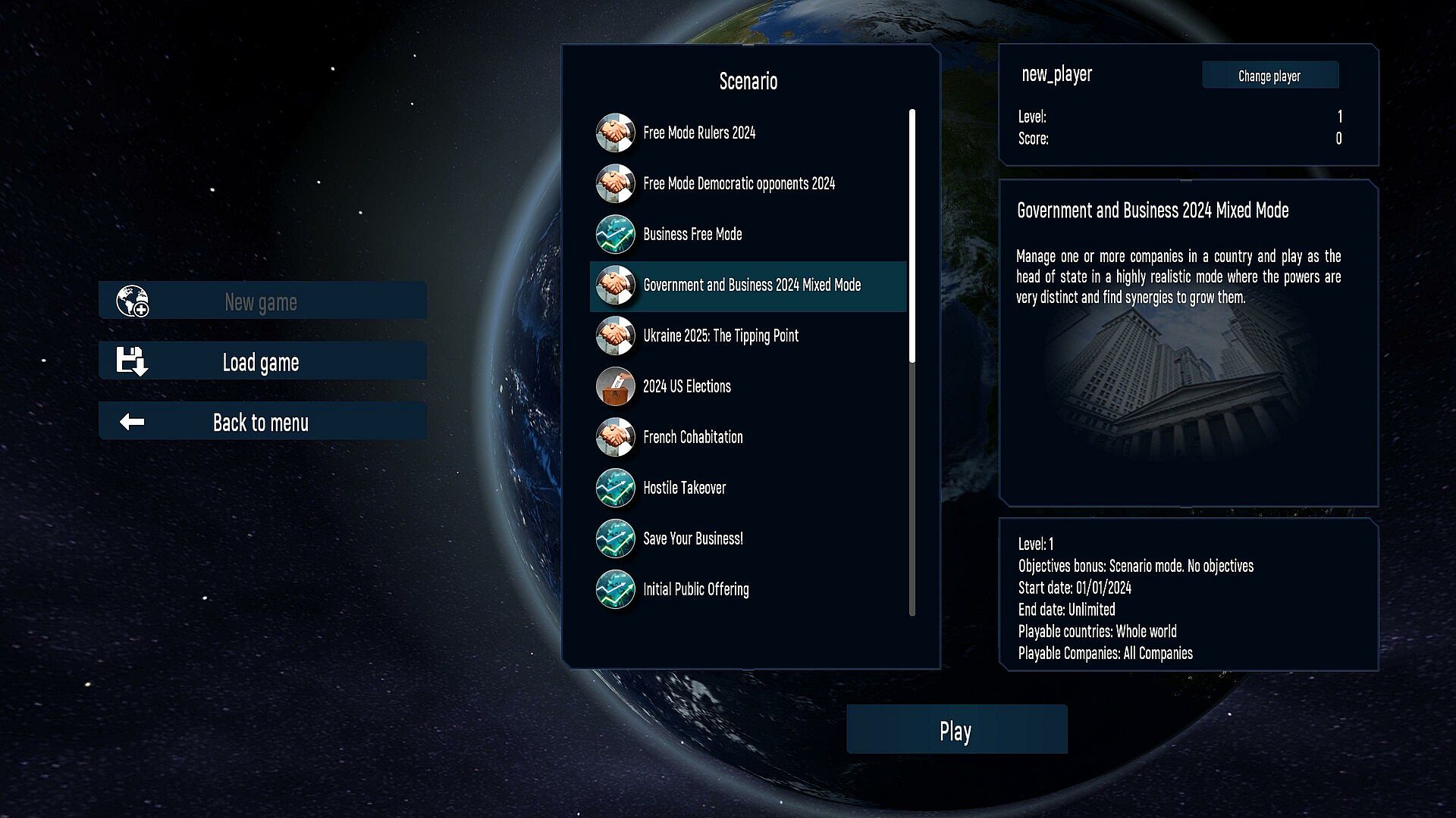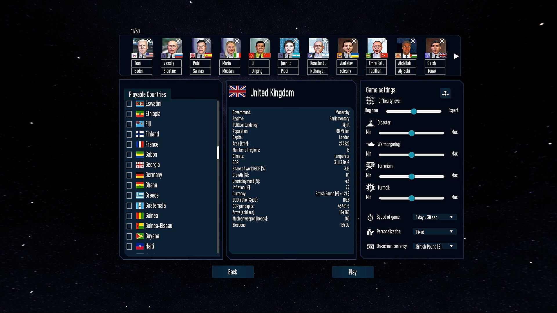 ● Game settings: terrorist activities, probabilities of natural disasters, reactivity of the populations, outbreak of war