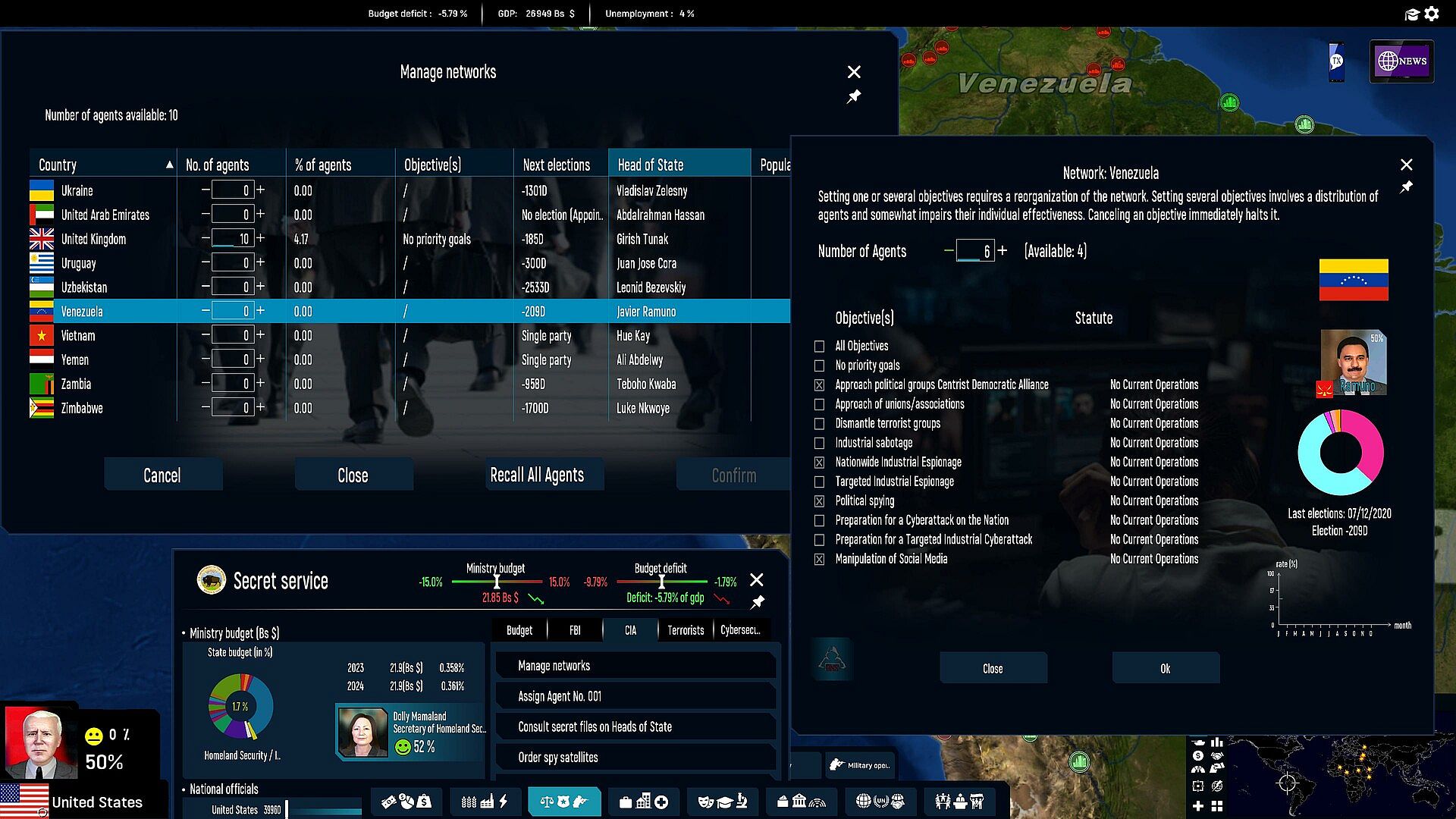 Secret services play an important role. They have an arsenal of espionage and special operations: reveal scandals about an opposing political party, dismantle terrorist networks, sabotage foreign infrastructure, assassinate an opponent, send reconnaissance drones or position satellites to locate enemy units, etc.