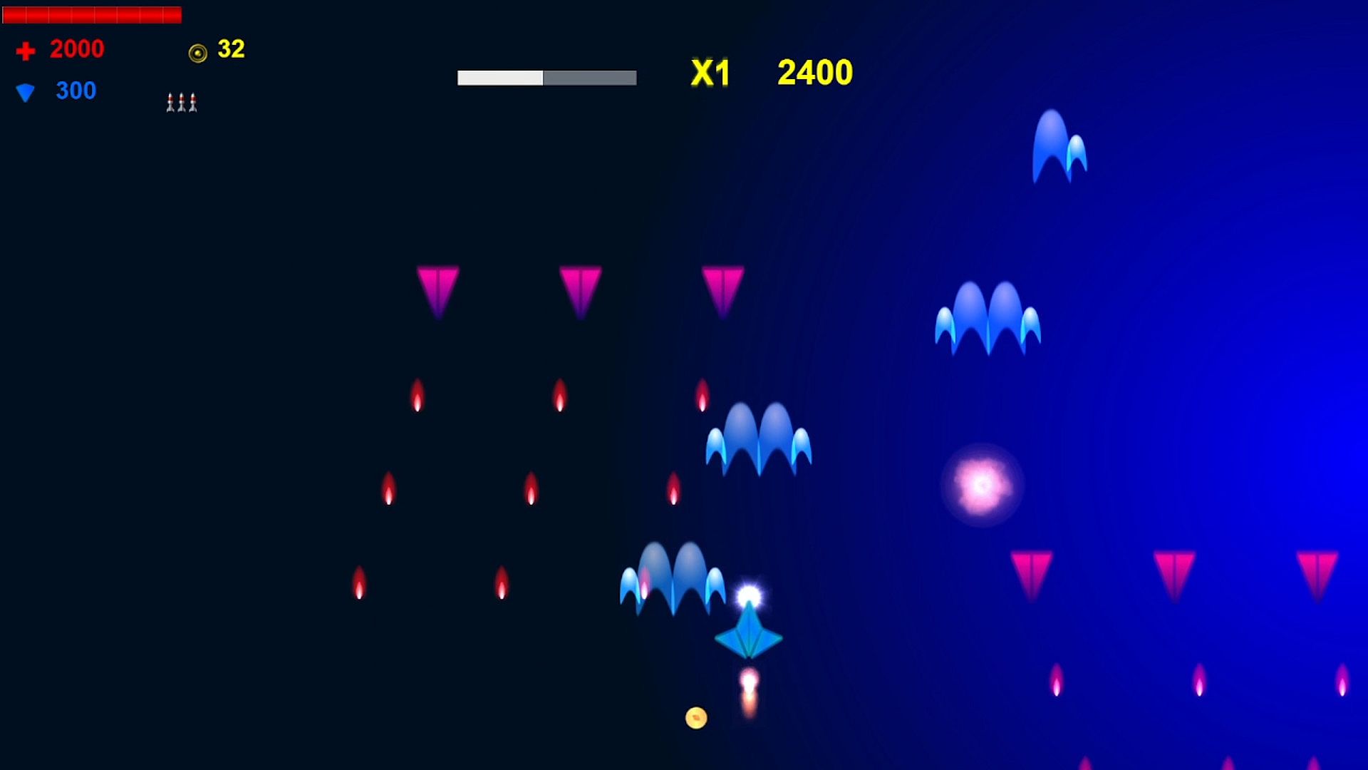 Shoot your way through waves of enemies and extreme bosses in this Roguelite space shooter. Advance in the ranks, upgrade your ship and unlock new mechanics, ships and mods that will make the game more challanging and interesting.