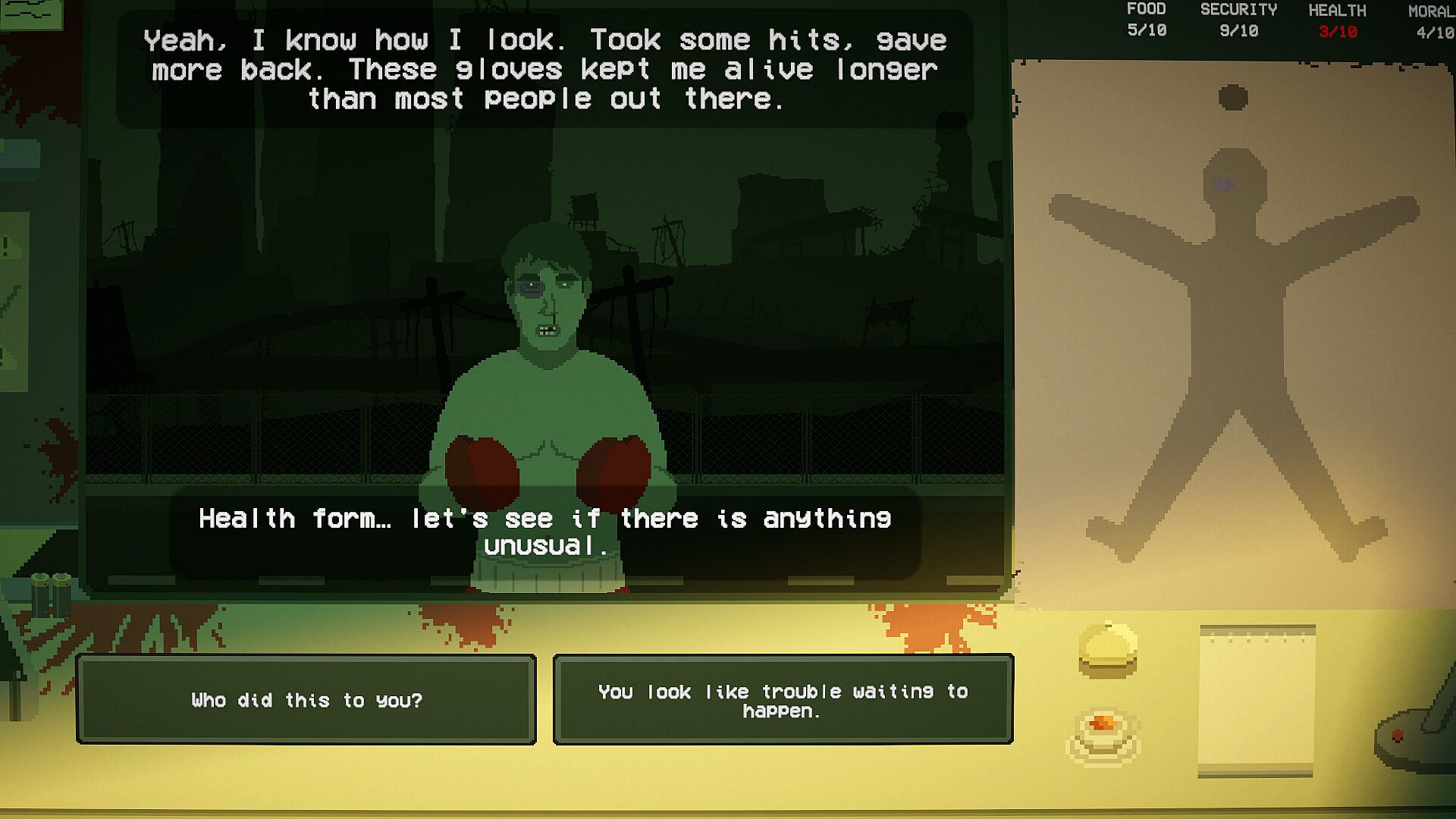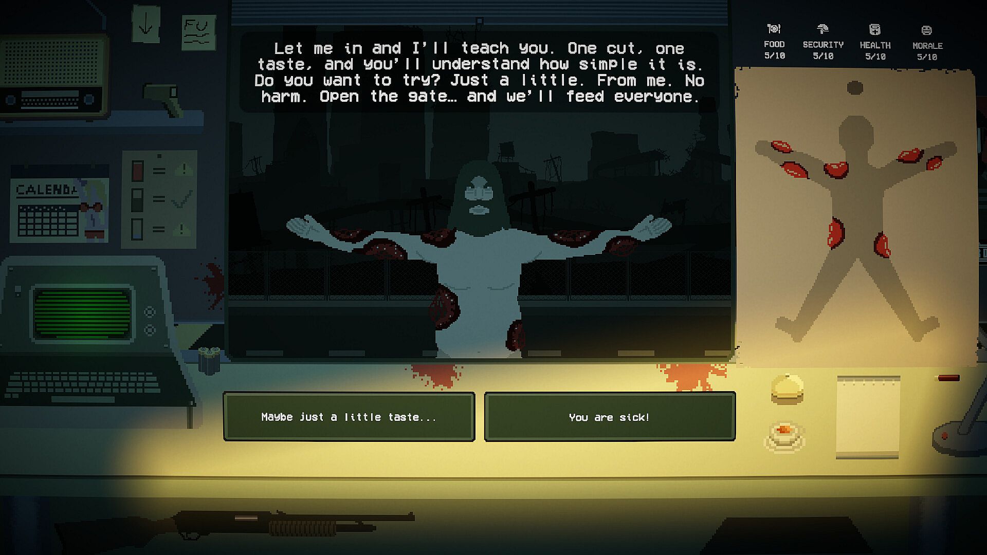 Each day, three strangers arrive at your gate, each with a story, a plea, and the potential of infection. Using limited tools and your own judgment, you must determine their fate: