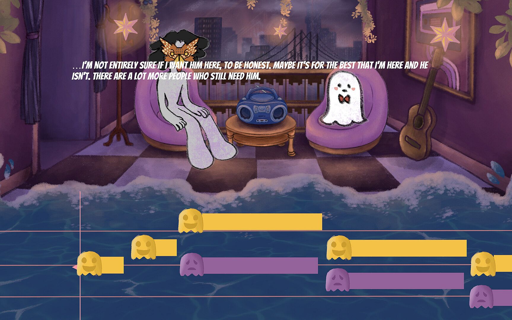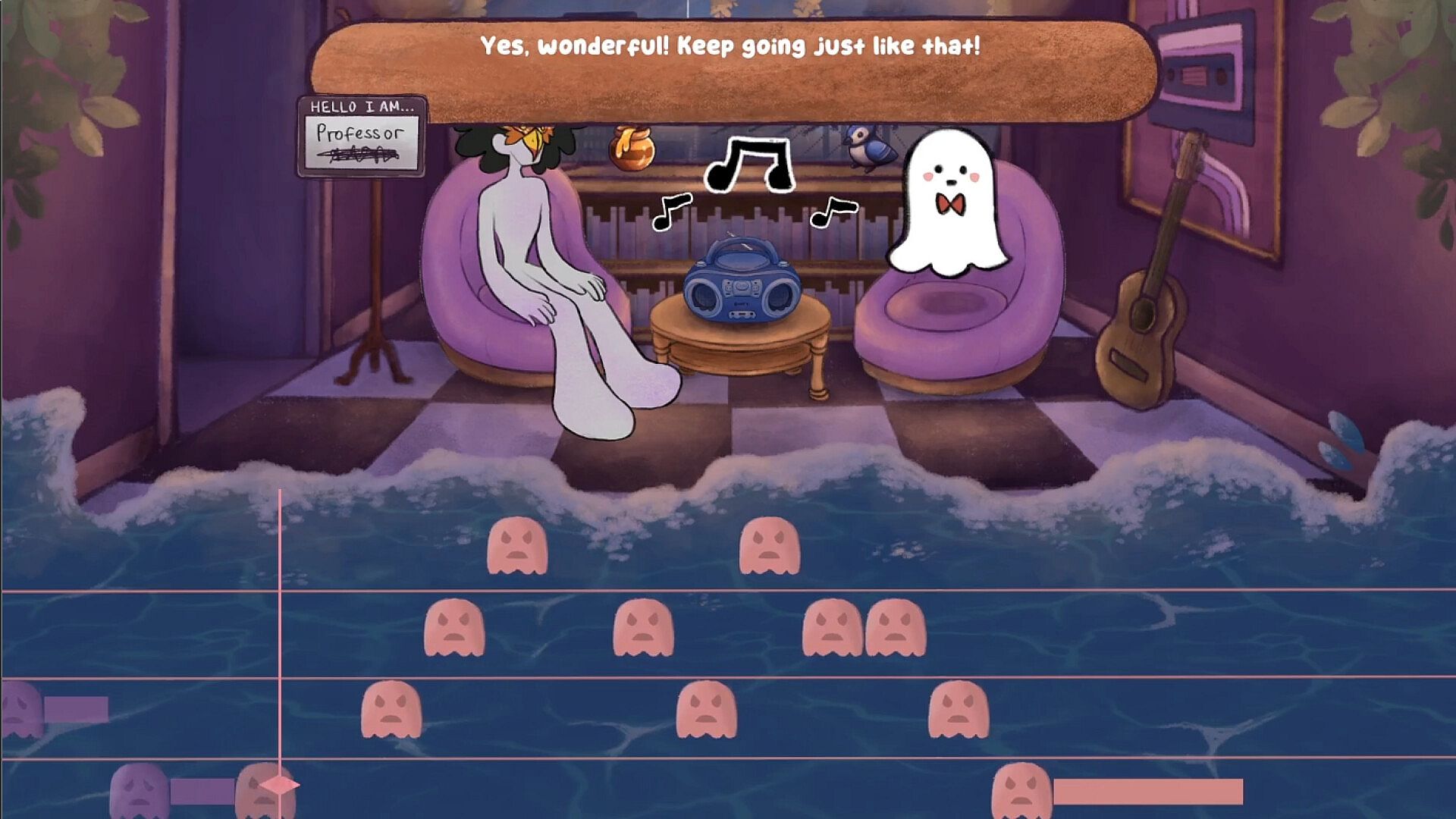 Take a seat, relax, and boo-gie your way into a happy afterlife in this cozy rhythm game! You're a ghost in purgatory helping lost souls move onto the afterlife with the power of music therapy!