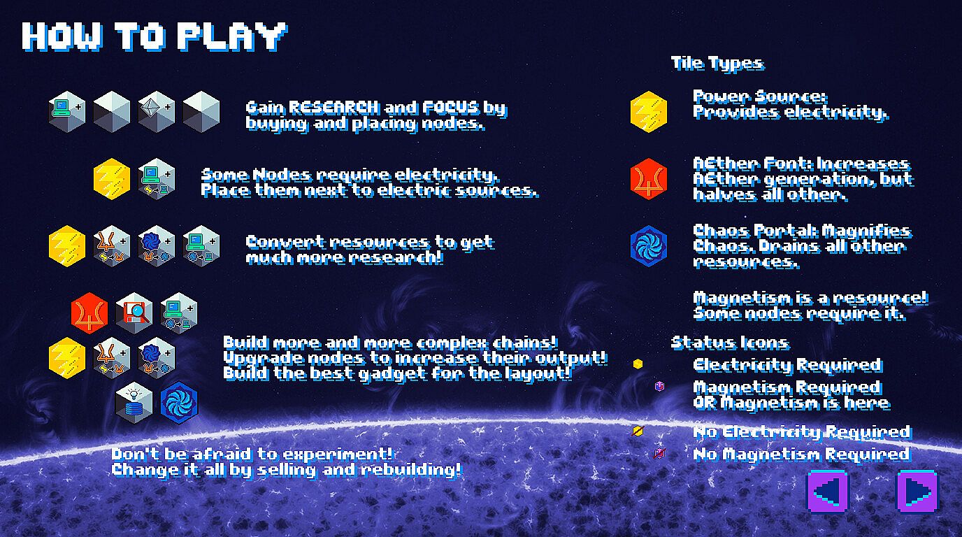 GENERATE RESEARCH AND FOCUS BY PLACING NODES IN YOUR GADGETS, USING THE RESOURCES TO UNLOCK MORE AND MORE WAYS TO GENERATE MORE RESEARCH AND FOCUS! RESEARCH UNLOCKS THE STORY OF THE GAME, EACH TIME UNLOCKING A NEW GADGET AS A NEW MAP TO BUILD AROUND! AS THE GADGETS GET MORE COMPLEX, HOW WILL YOU CREATE EACH GADGET TO MAKE THE BEST USE OF THE SPACE AND RESTRICTIONS?