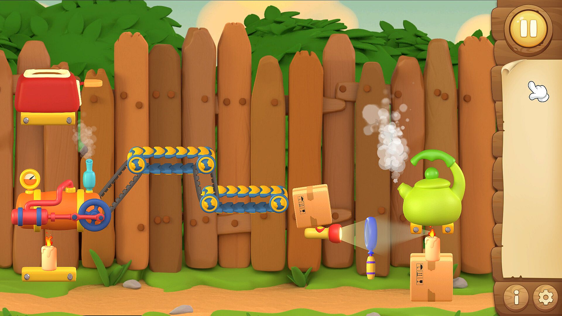 In Gizmo, you’ll use different tools and components to build contraptions that solve specific problems presented in each level. Maybe it’s a conveyor belt here or a burner – but every solution is up to you! No strict paths, just you, your imagination, and some tools.
