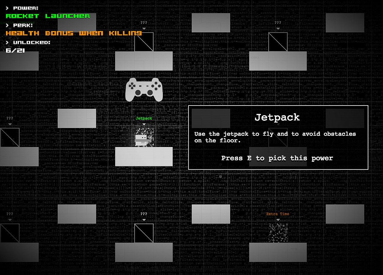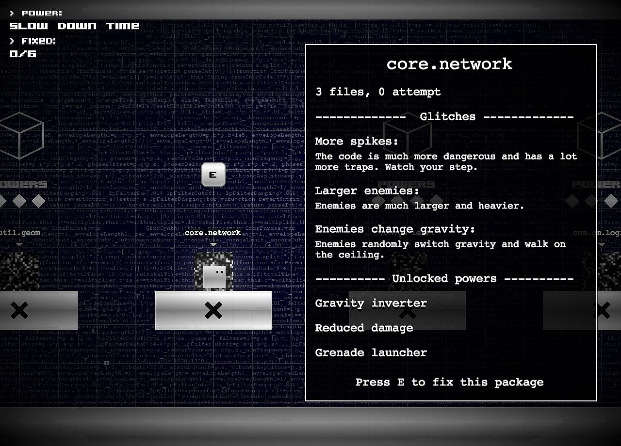 In order to help you fix all these glitches, you can unlock special powers, such as a rocket launcher, a teleporter, a gravity inverter, a shotgun, as path finder... as well as a perk, which will make your job easier, for instance by reducing damage, dropping more items, giving you more health...