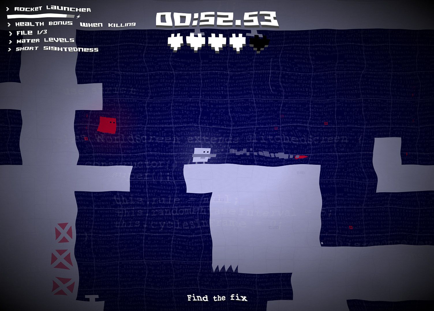 Each level features a different set of glitches that will affect the gameplay: low gravity, water physics, larger enemies, bigger explosions... and many more (there are currently over 40 glitches implemented in the game).