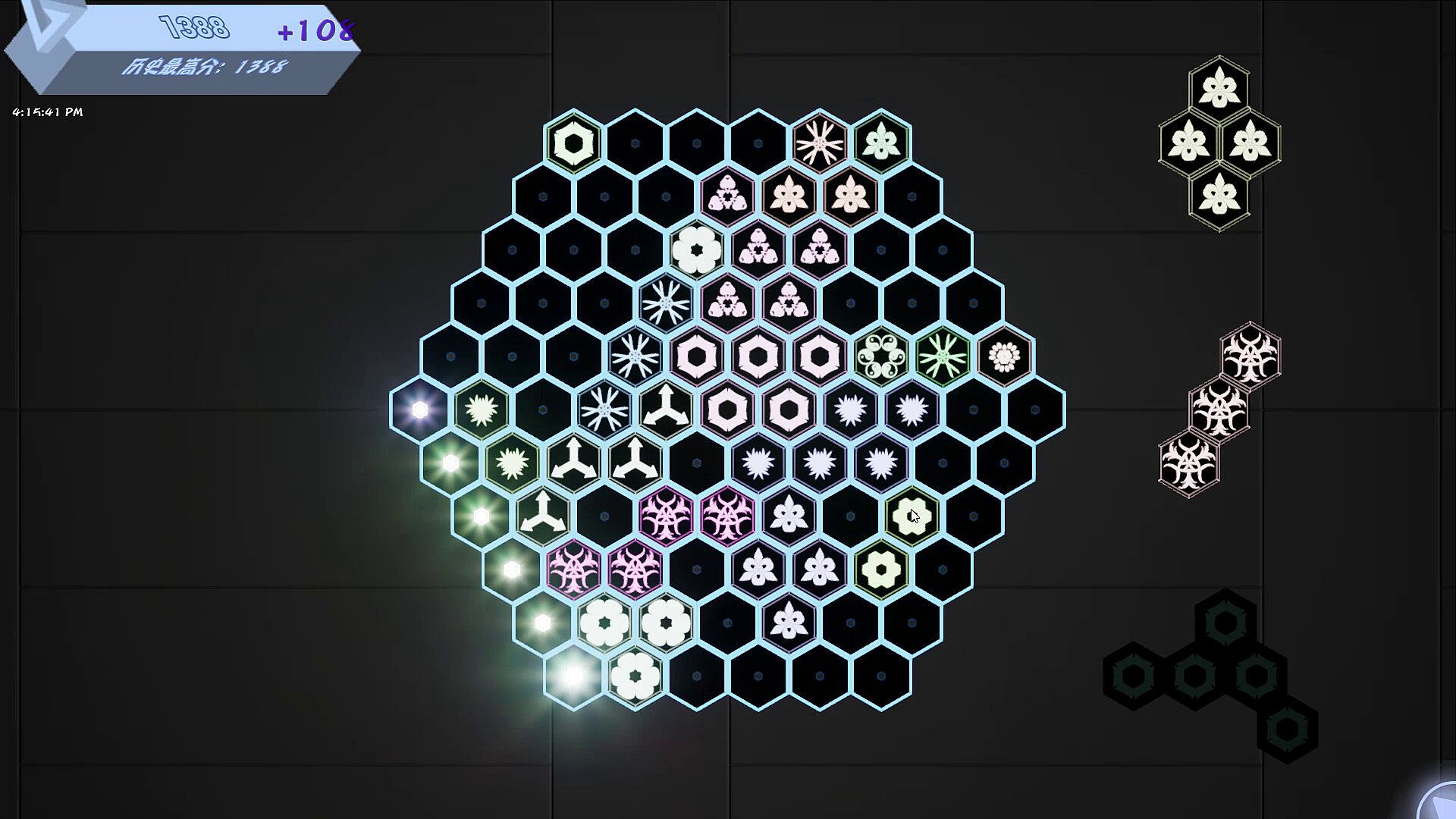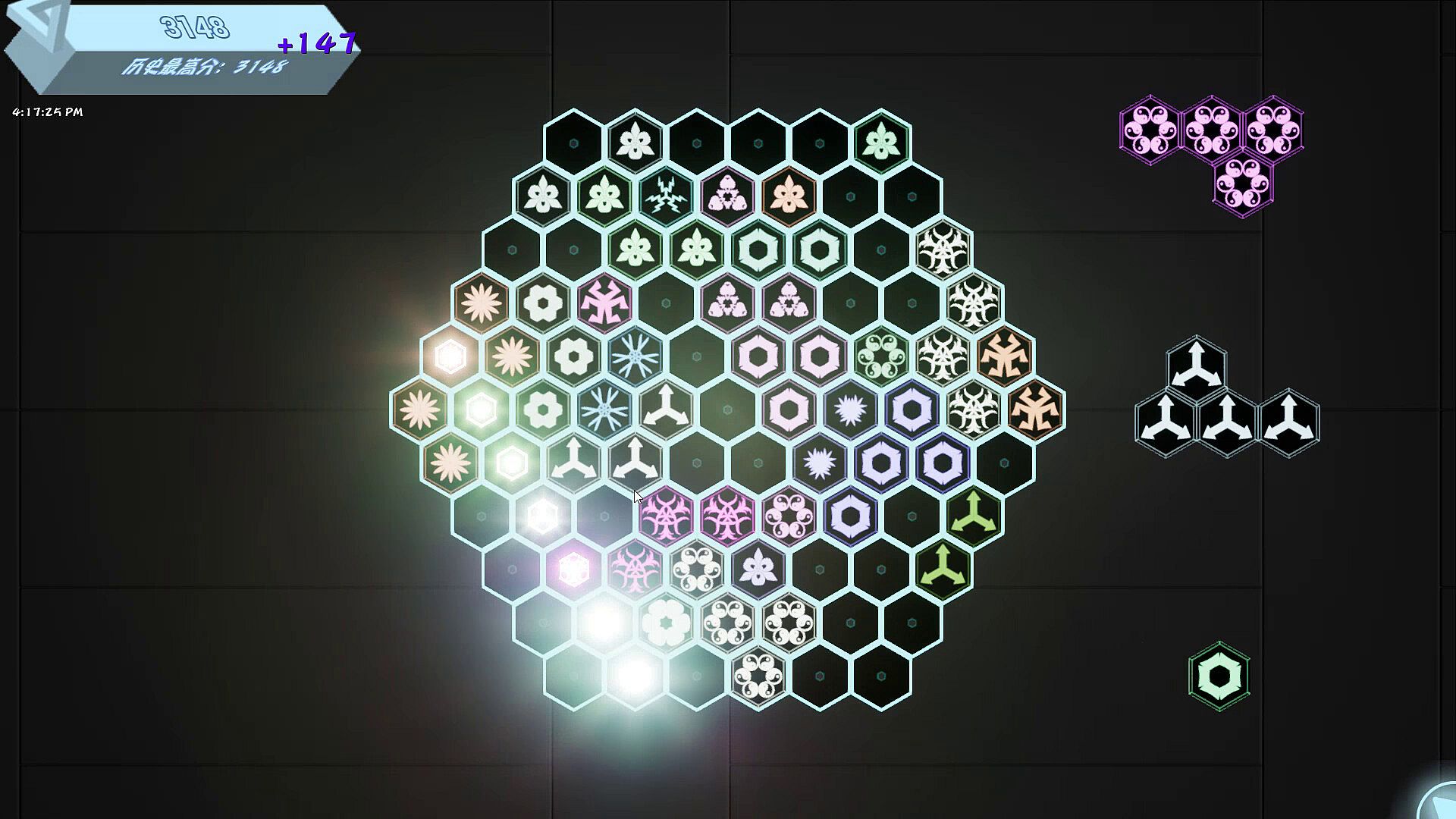 Hex tiles are generated randomly, including both patterns and colors. The variety ensures refreshing gameplay and prevents monotony.