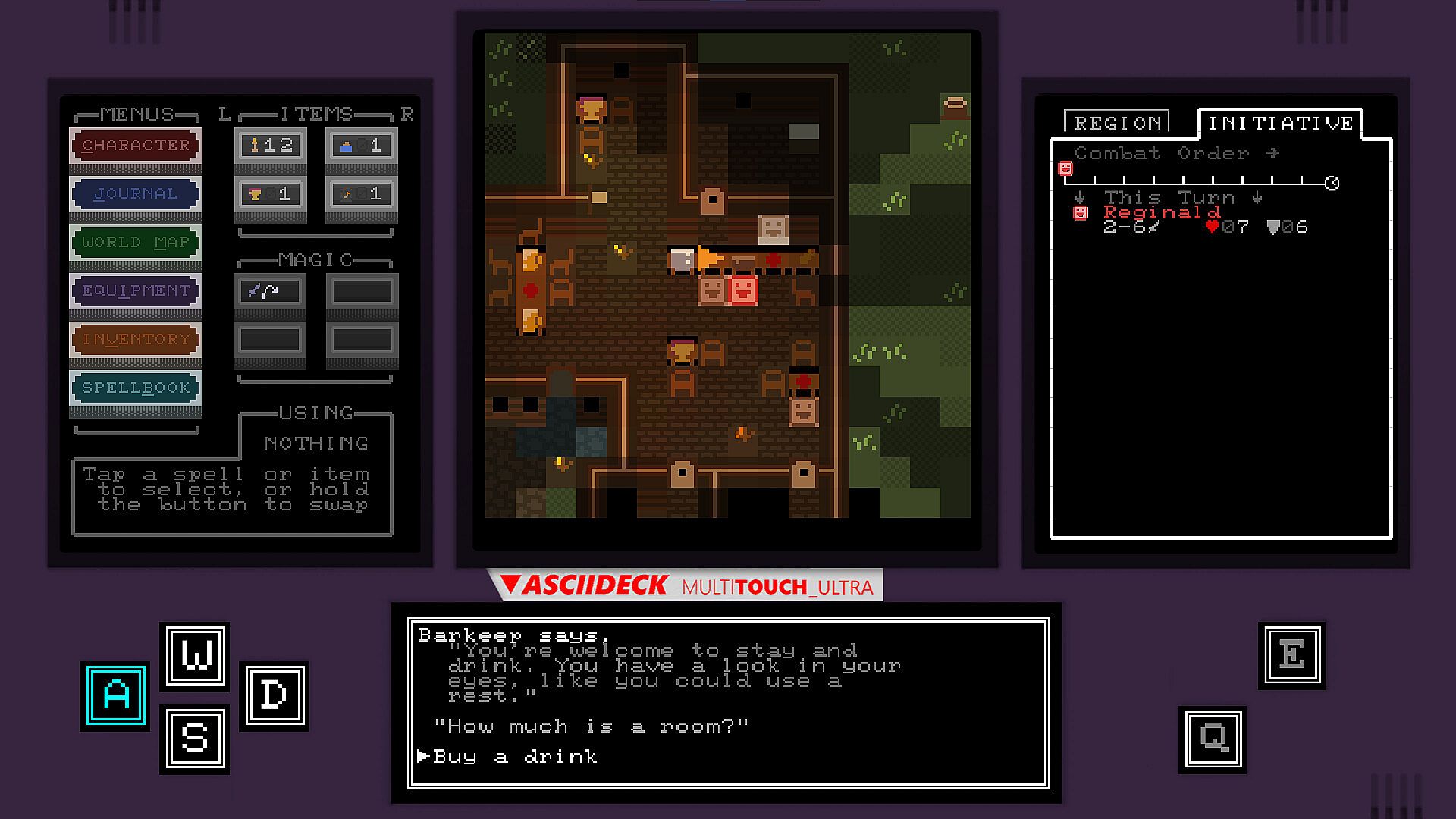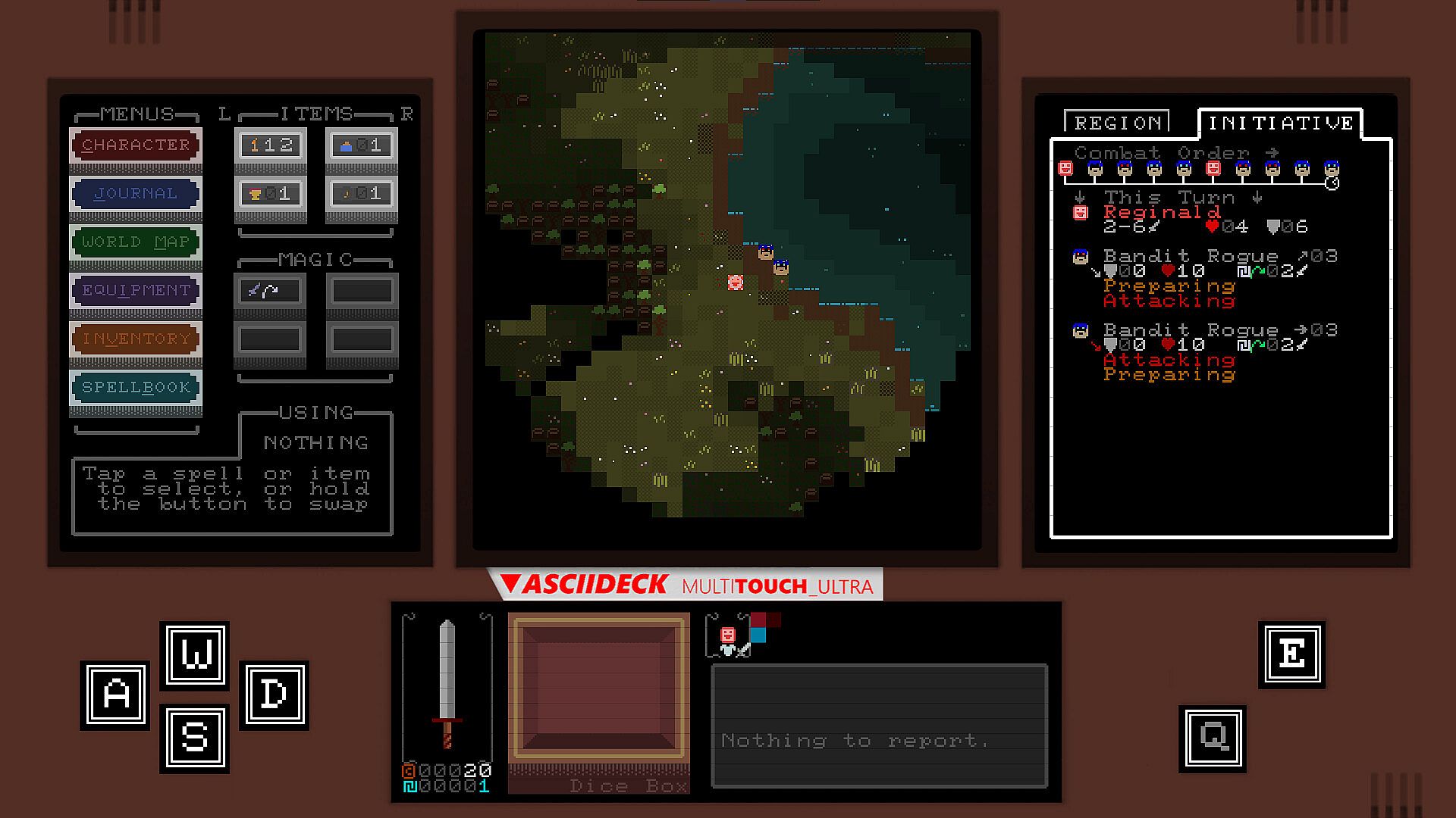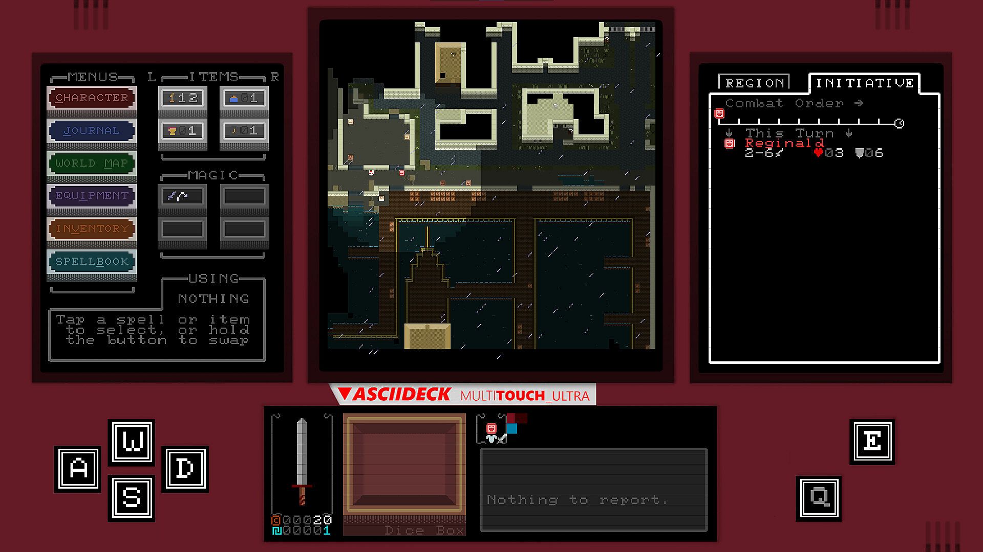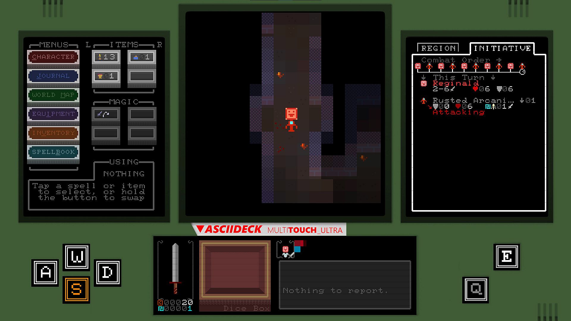 The environment holds many surprises, but there are no secrets between foes in Glyphscape's combat. As this is a turn-based RPG, you will have ample time to strategize and plan your next move. To ensure no blunders, the relevant combat statistics are displayed on one of the ASCIIDECK's auxiliary display screens. Player weapon and spell damage is determined by dice roll, so there is always room for surprises.