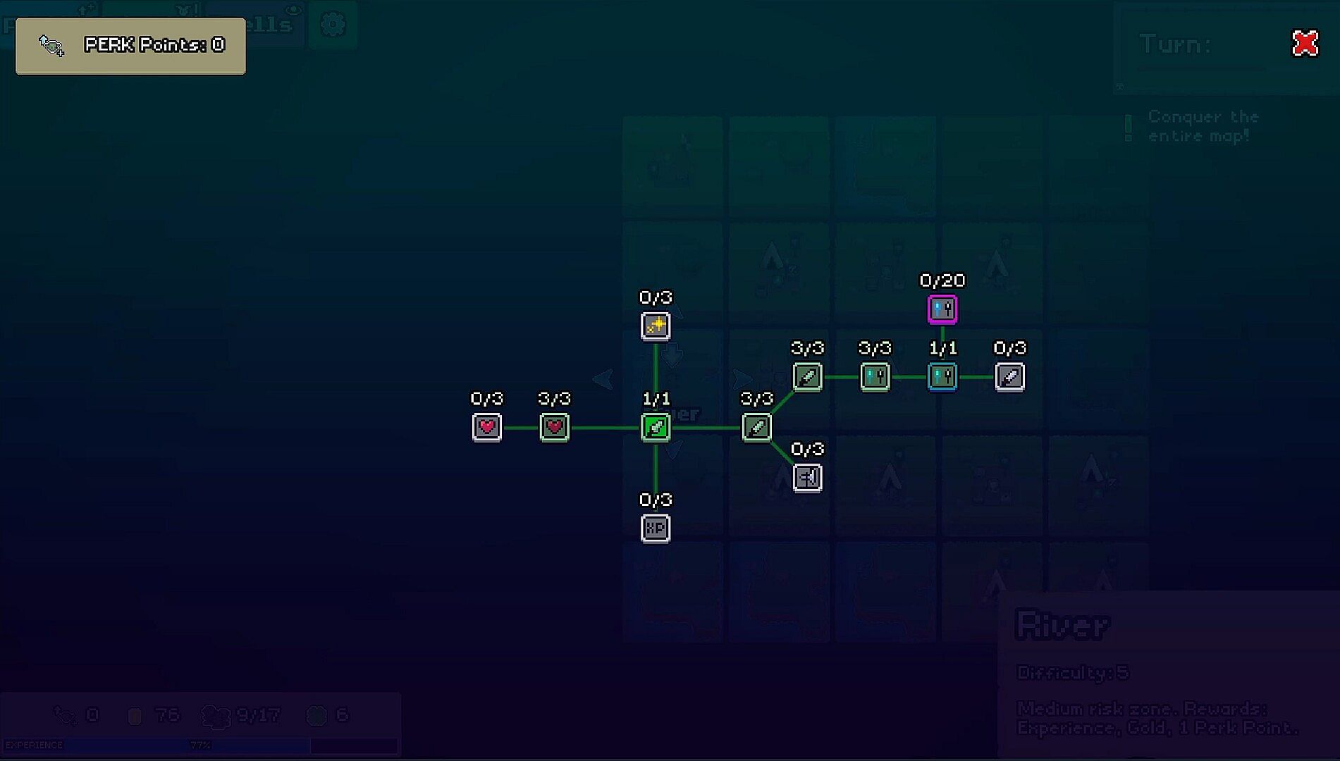 Every move on the grid counts as a turn. Plan your path before difficulty scales up, and construct buildings on empty tiles to gain recruits, gold, or stats.