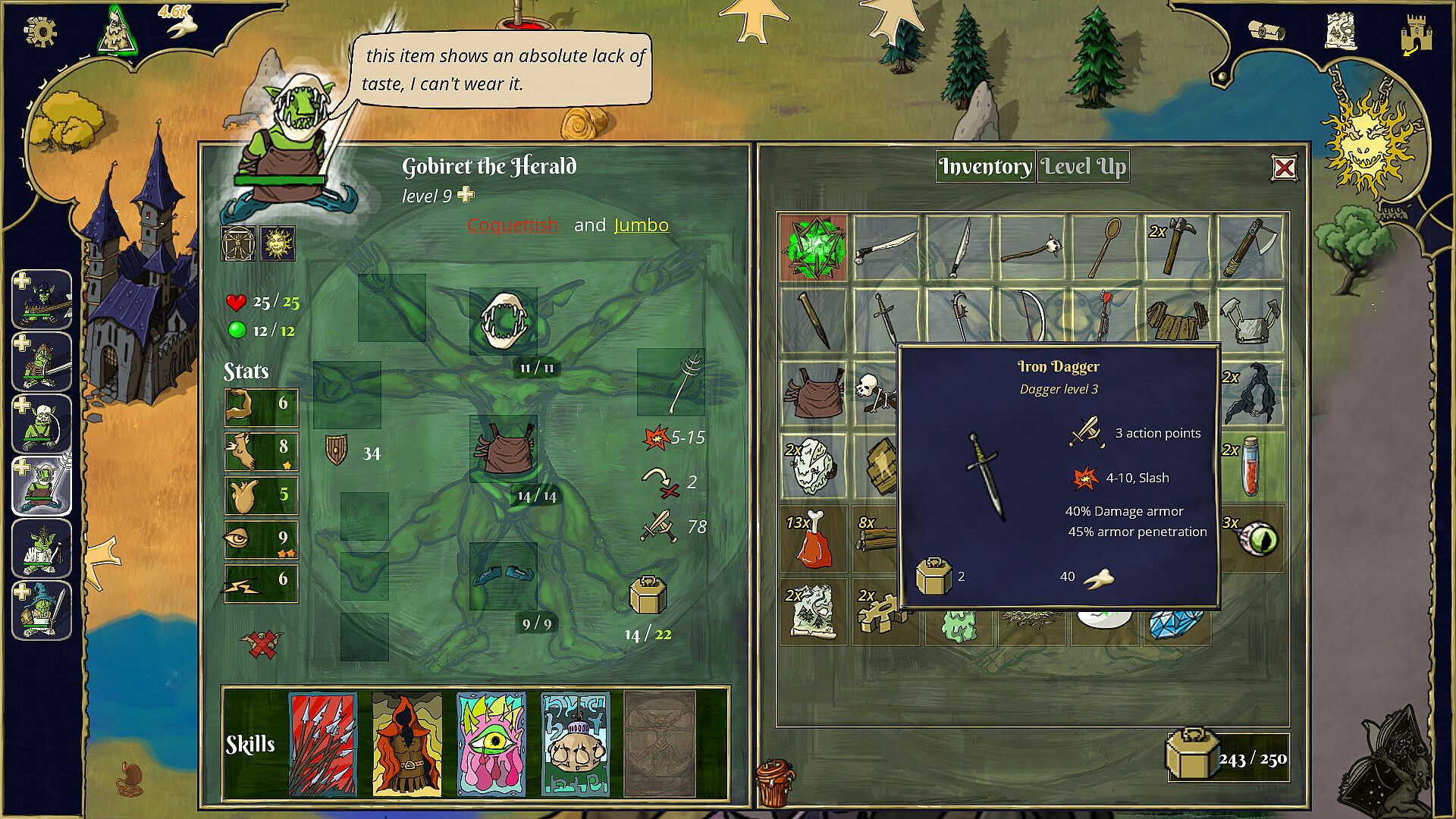 Hire, equip and level-up a band of goblins to fight and die for you in tactical turn-based battles, while you uncover the secrets of this world, and maybe find your way out of there!