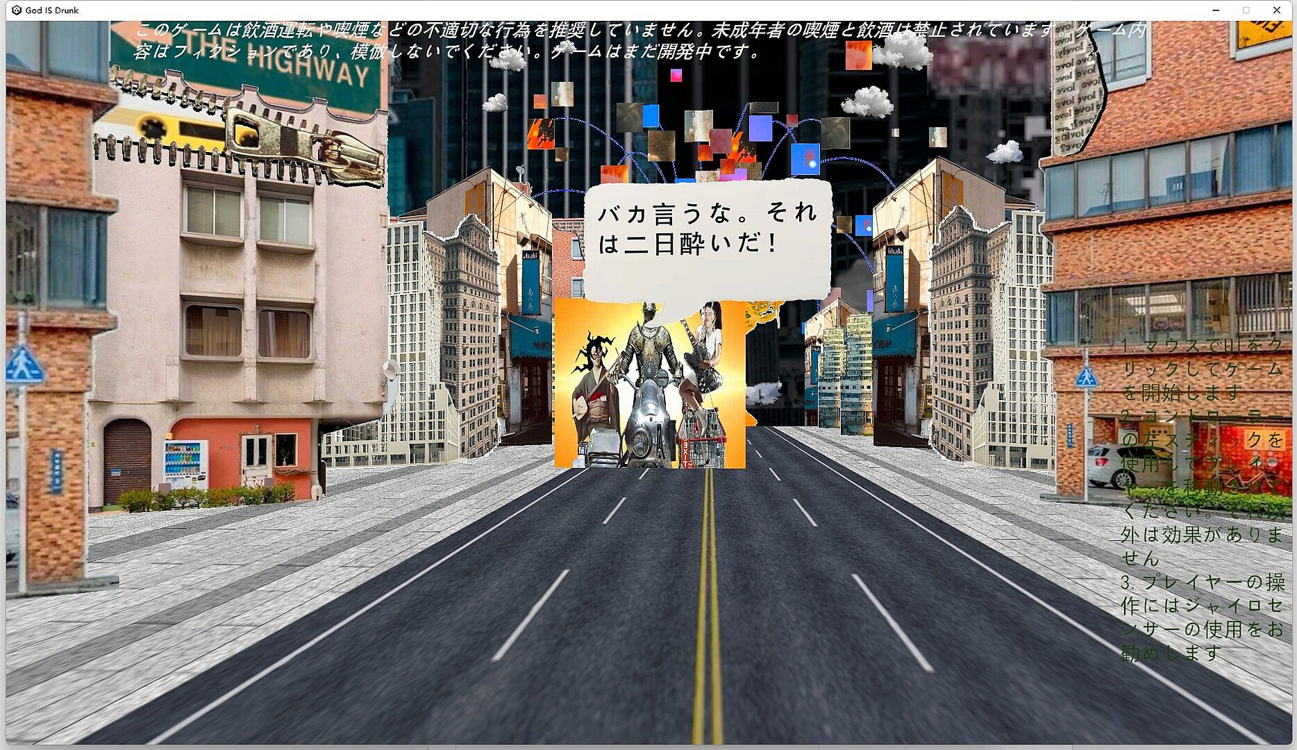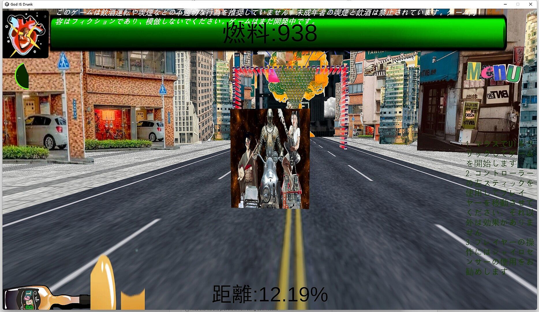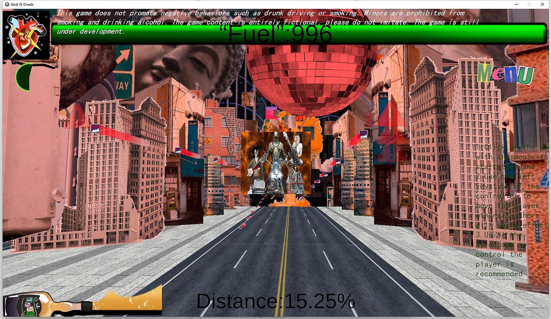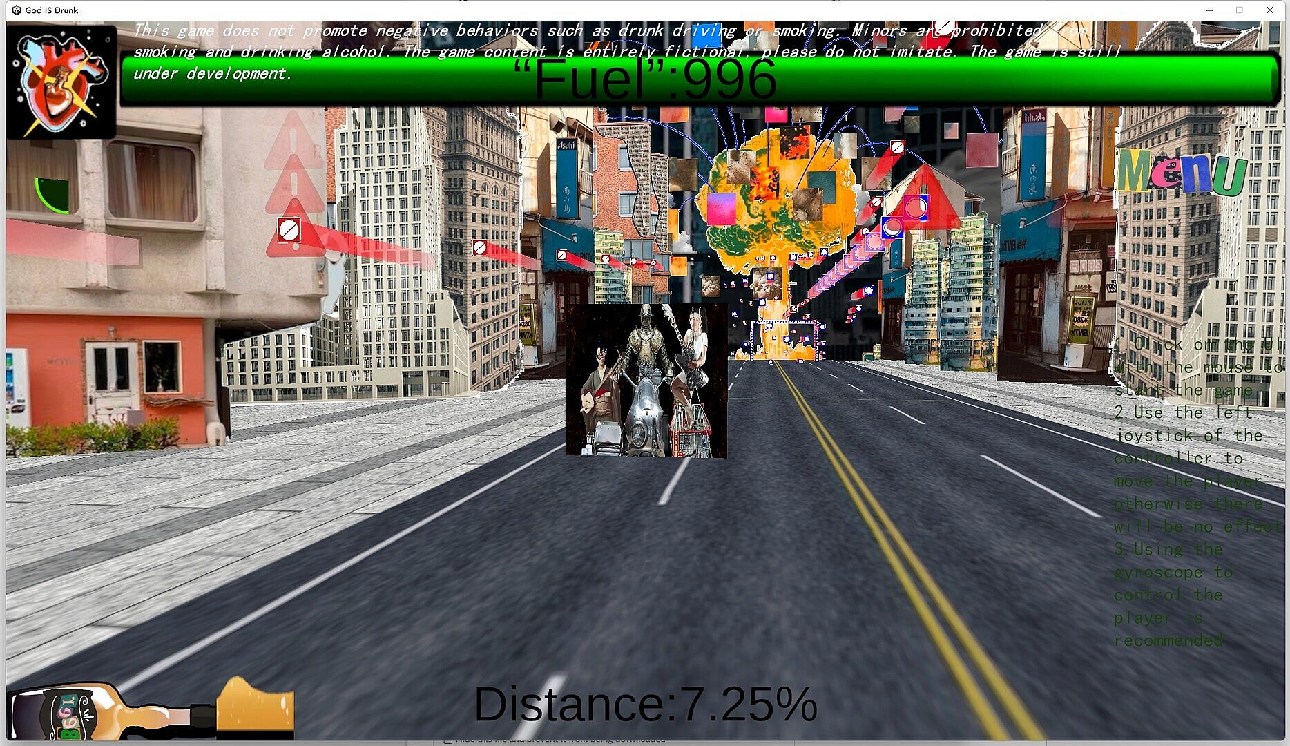 You'll lead three drunkards pushing their motorcycles and running wild on the streets, carrying years of treasured fine liquor, racing through the apocalyptic city while dodging anything that could knock you down, ultimately rushing toward that old buddy you haven't seen in ages!