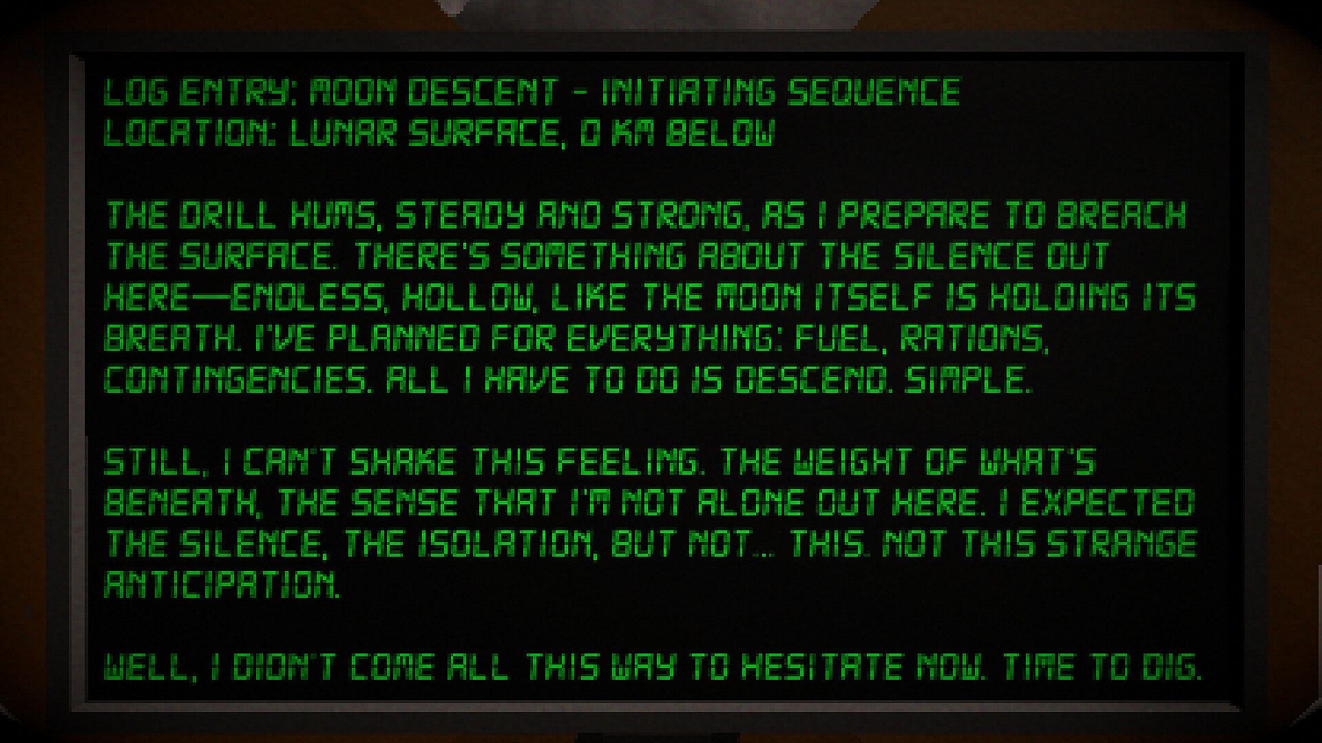 Beneath the dead, ashen surface of the moon lies a secret beyond mortal comprehension. Driven by whispers of the divine, you descend into its unfathomable depths. Each strike of the drill unravels sanity, drawing you closer to a god that no man was meant to find.