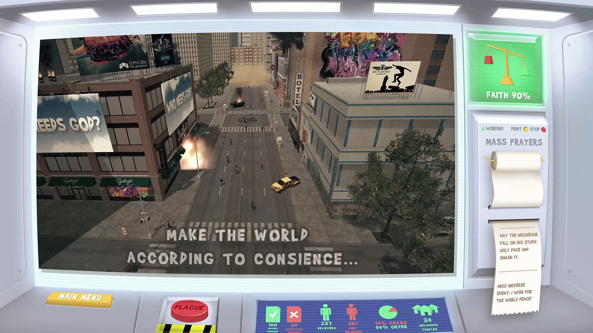 Become an omnipotent observer in this holyrious adventure and decide the fate of all those who inhabit the world, through a powerful control panel that receives everyone’s prayers. What kind of God will you become - will you hear their pleas and pilot this planet to a paramount of peacefulness or will you take a step back, letting Earth erode into ultimate chaos?