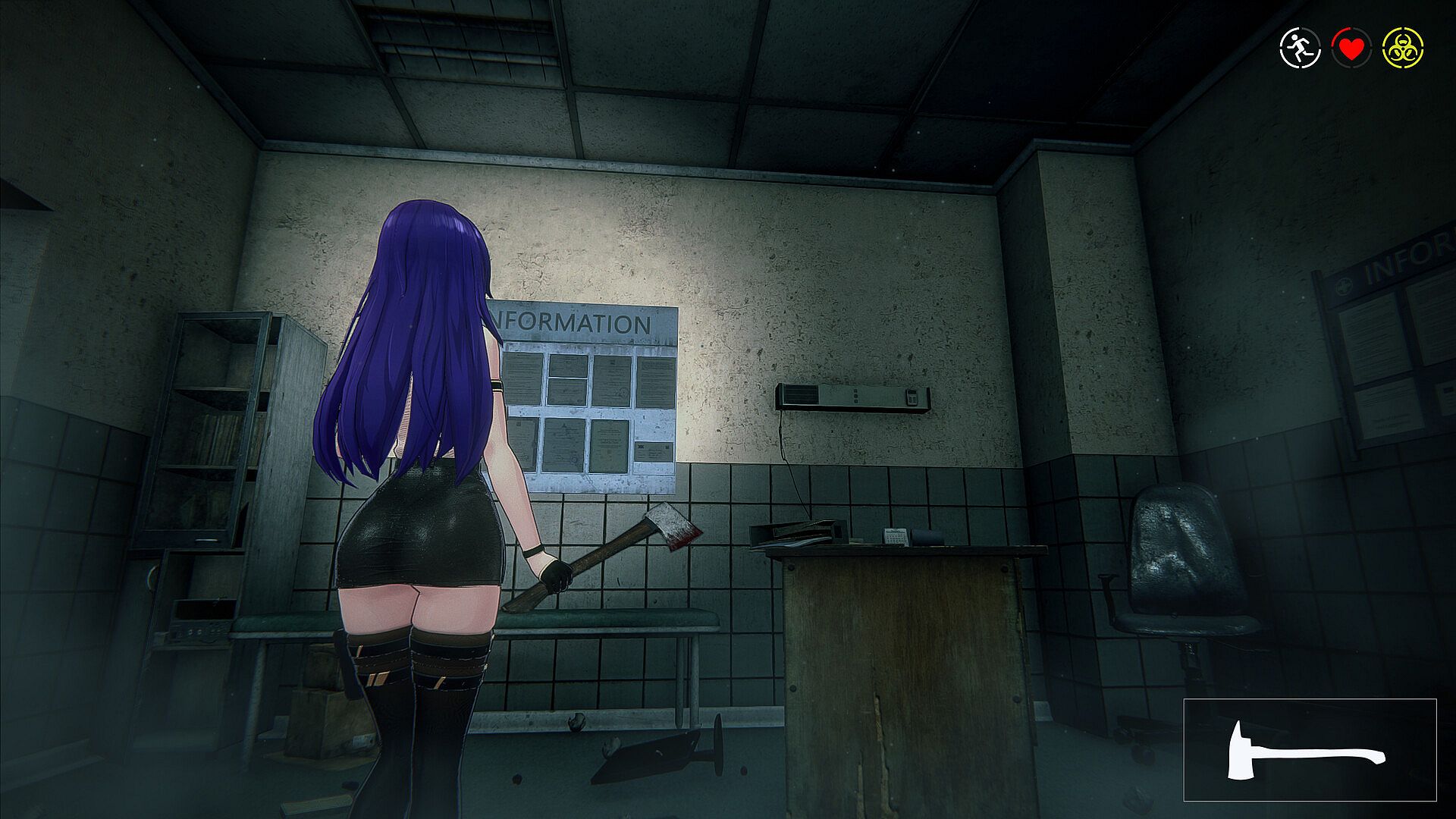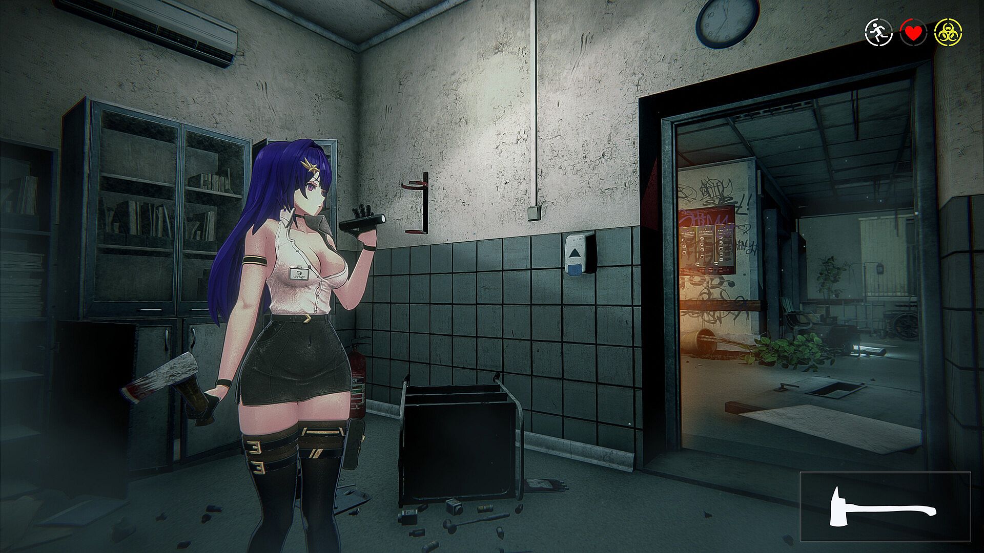 As night falls, you return to base to prepare for the challenges ahead. Upgrade weapons and gear, strengthen your defenses, and customize the girls’ outfits. Then, under the cover of darkness, you send a chosen heroine out to scavenge. Taking control once more, you guide her through dangerous buildings, fighting off lurking zombies and collecting precious resources needed to survive another day.