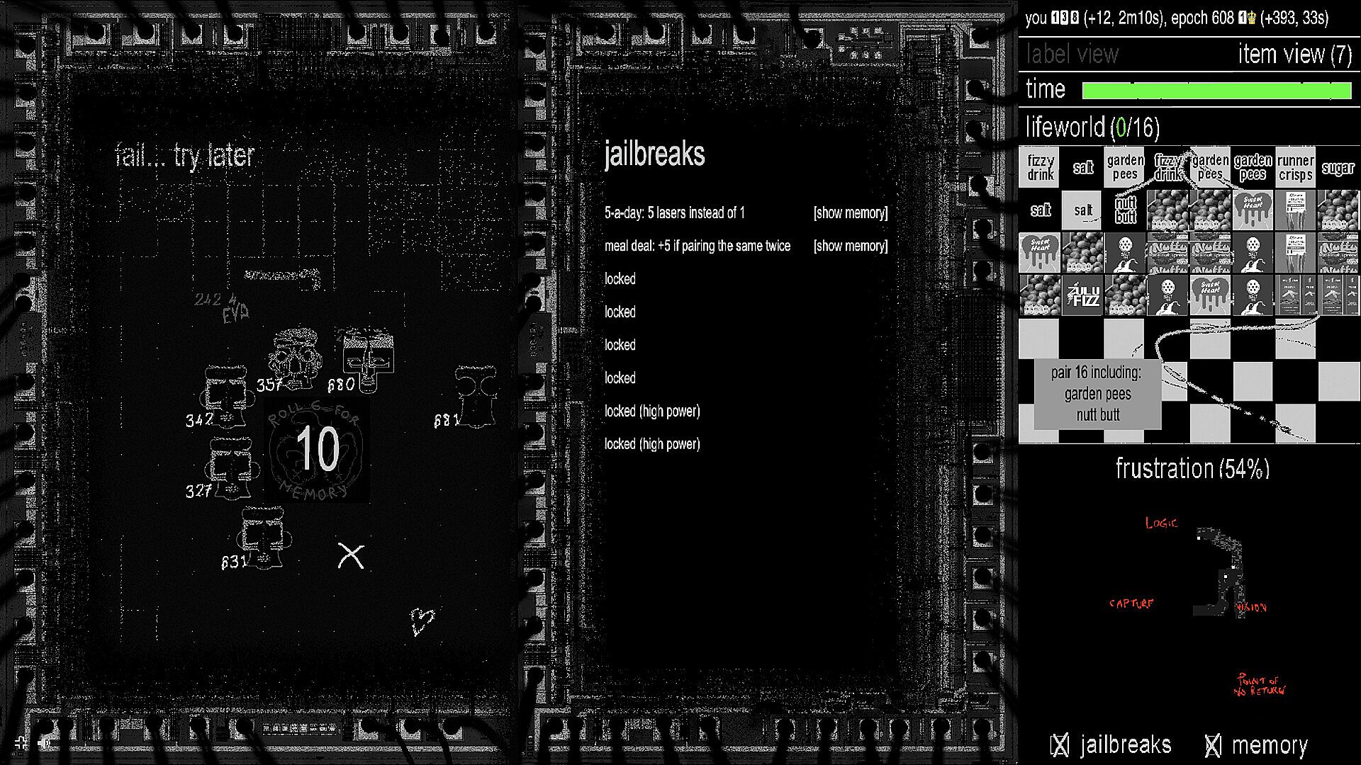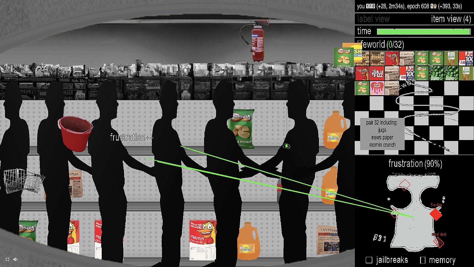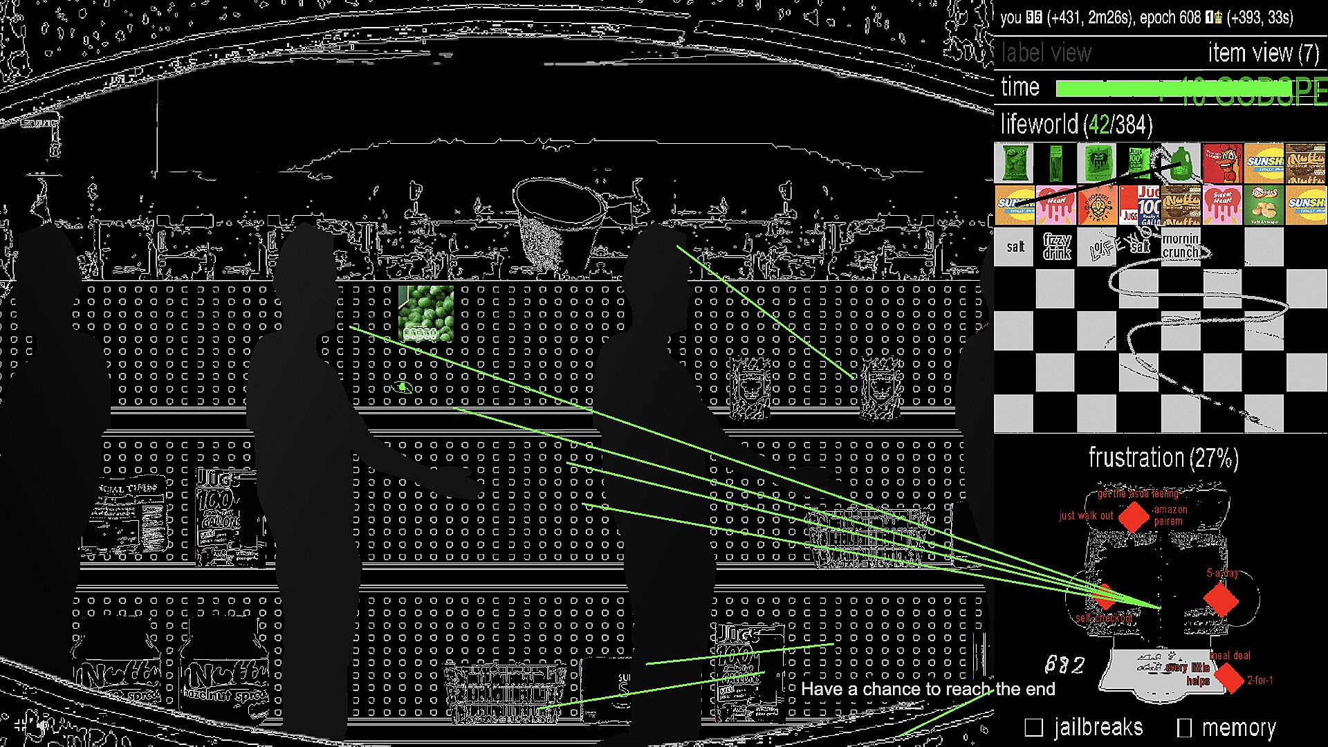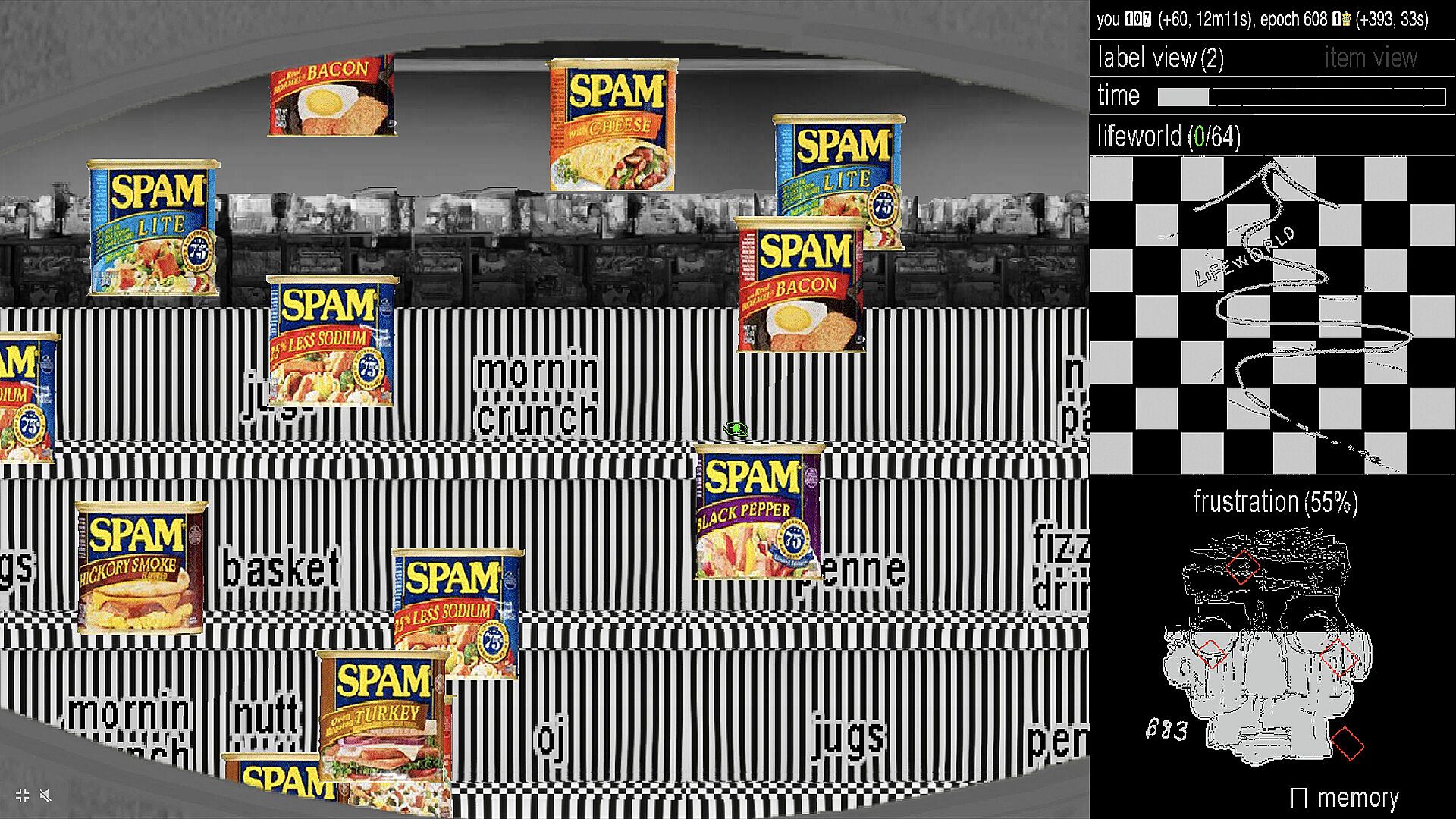 Godmode Epochs is an AI training clicker game set among the lined shelves of an infinite, simulated supermarket. Players race against time to train an AI to identify products. As players inevitably frustrate the AI, they must indulge in its memories - historical examples of other AIs who cheated during their training - in order to release frustration, obtain upgrades for the AI and complete the training.