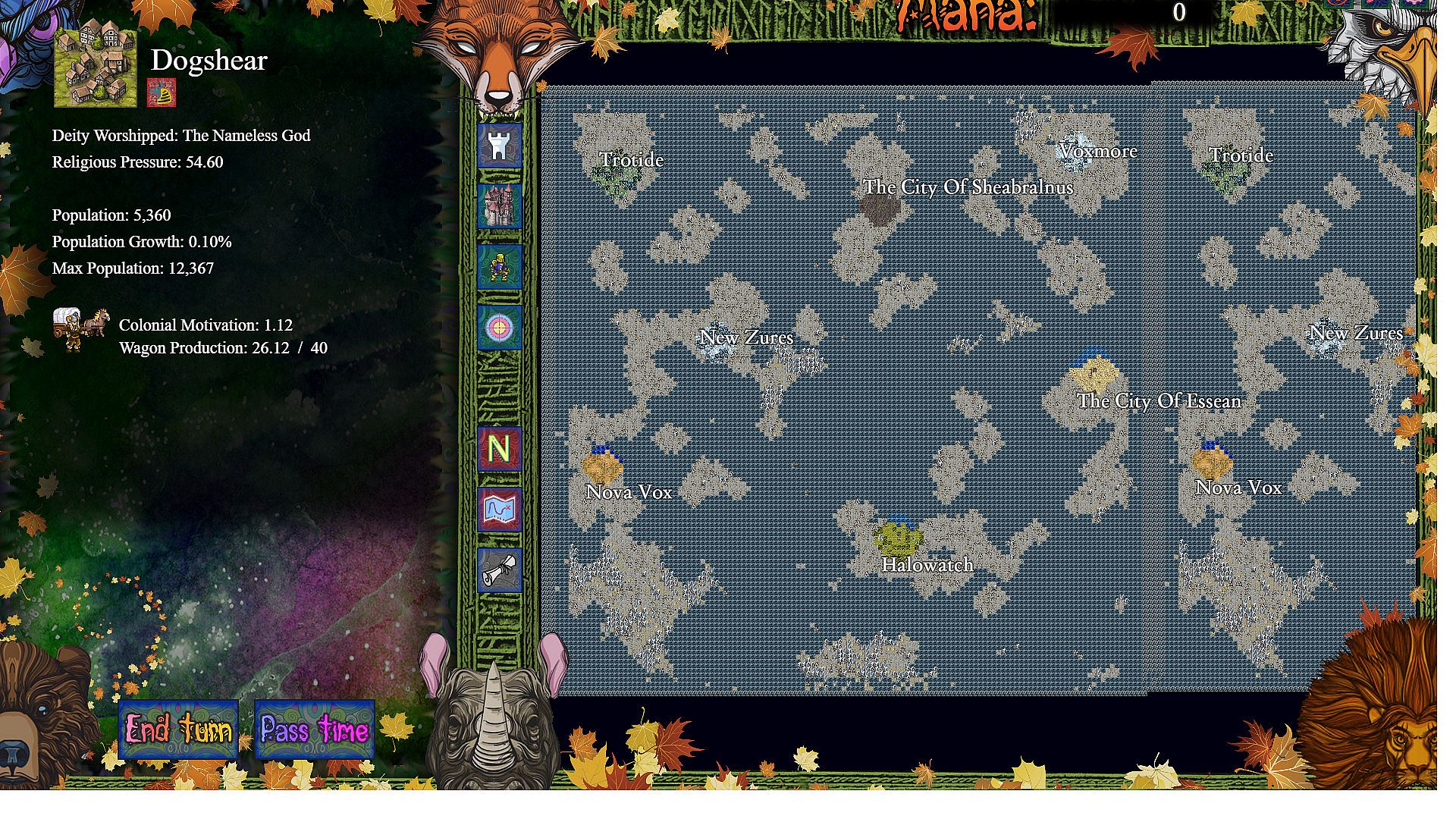 You take the roll of a god, to a sentient, and self-governing populace. With no interference from you, your people will spread out across the land, create villages, temples, taverns, and castles; go to war, build fantastic structures, and reshape the landscape… that is, they would, if there weren’t other gods, and other races, waiting to stop them.As a god, you have the power to aid your people with powerful magics, and to guide their progress with suggestions and dreams. Even with your help, it may not be enough to defeat the brutal and magical forces building against them.