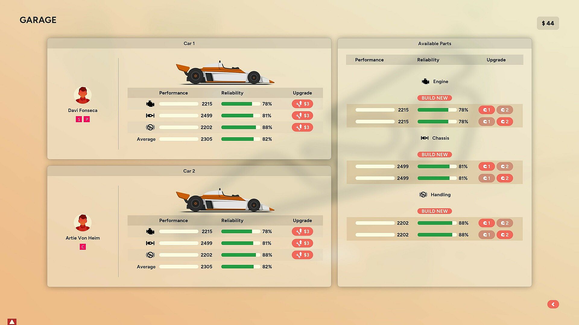 Build a winning team with drivers, a head engineer and a crew chief. Every hire comes with rich personality traits that affect everything from finances to car performance and skill behind the wheel.