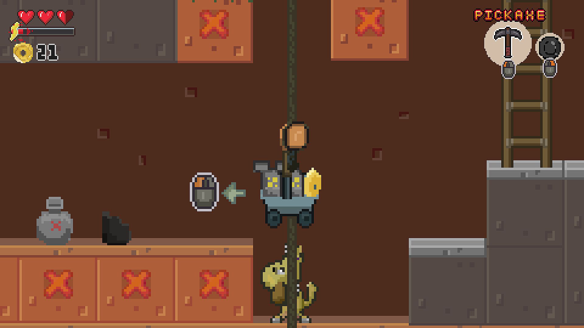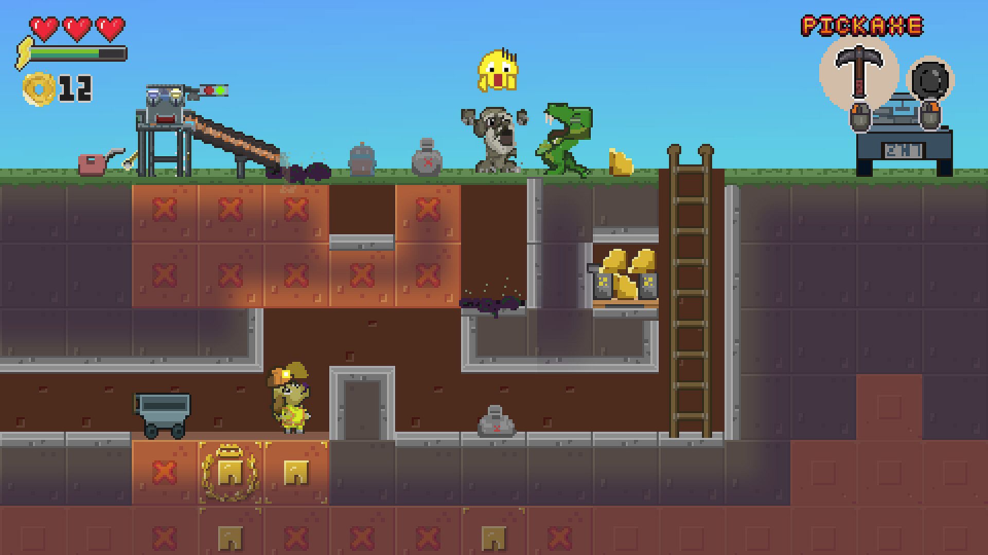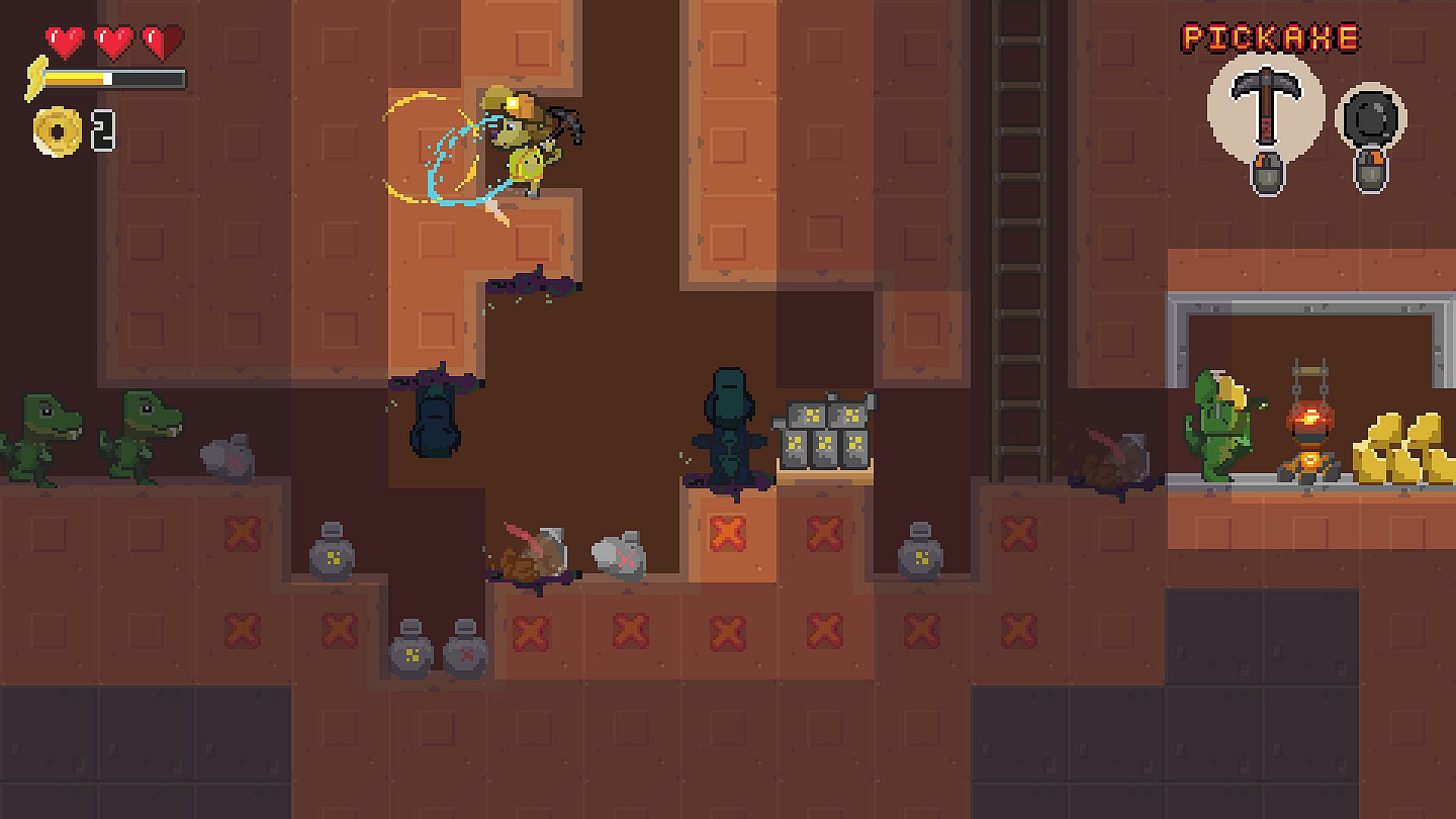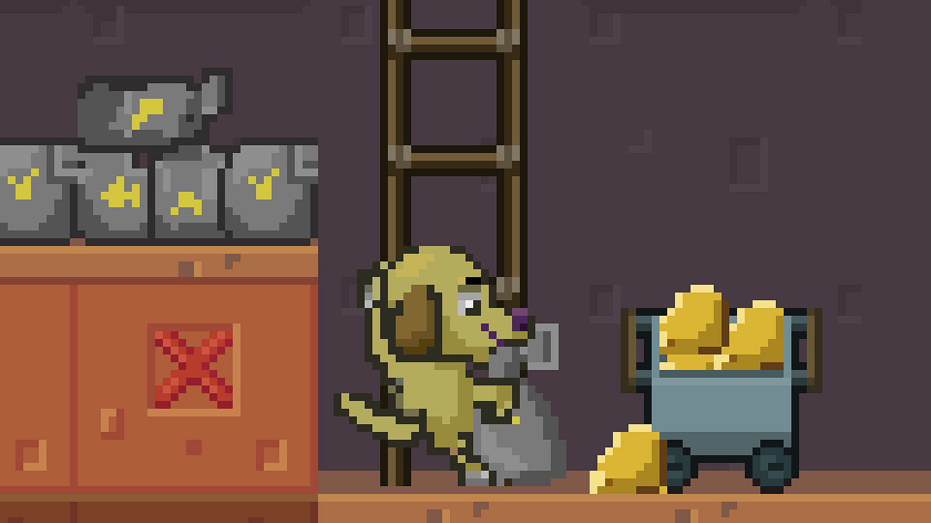 Fat Cat wants his rent and the only way to get it is deep in the mines. In this 2D sidescrolling strategy/resource management game, excavate and traverse your underground mine shafts to retrieve gold! Go into the mines and extract as much gold as you can. Setup your operation and reinvest your earnings into better gear and equipment to mine more gold and win the game! This line of work not only separates the gold from the dirt, but the pups from the dogs. With danger lurking in these ancient grounds, hungry Dinos awaken, searching for prey and loot. The wise miner doesn’t fear the Dino but sees it’s flesh and bones as a potential fuel source for their operations. Gold mining is a treasure hunt, so open your miner’s map, test some dirt, and find that stash of gold!