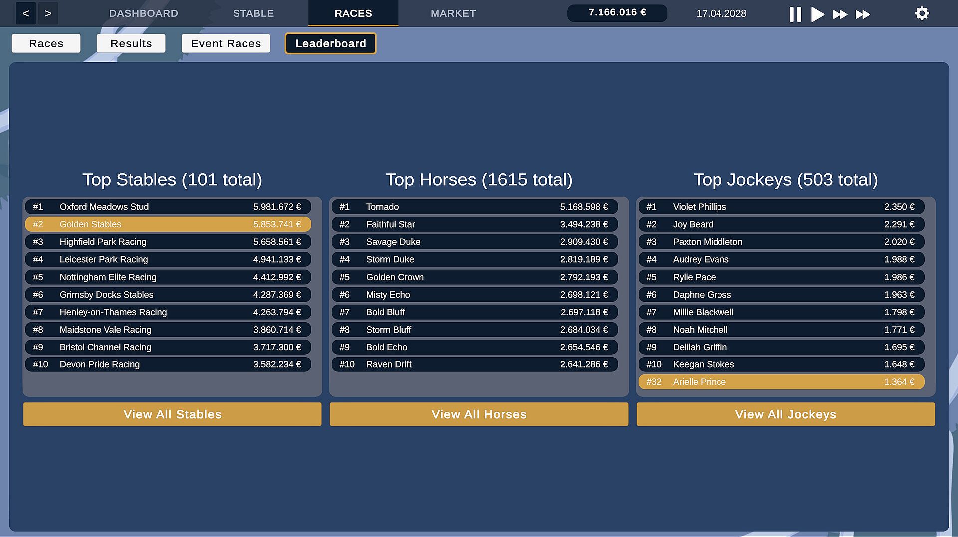 Golden Stables is an authentic horse racing simulation with depth: Train your horses strategically, manage your finances cleverly, and put together the perfect combination of horse, race selection, and jockey.