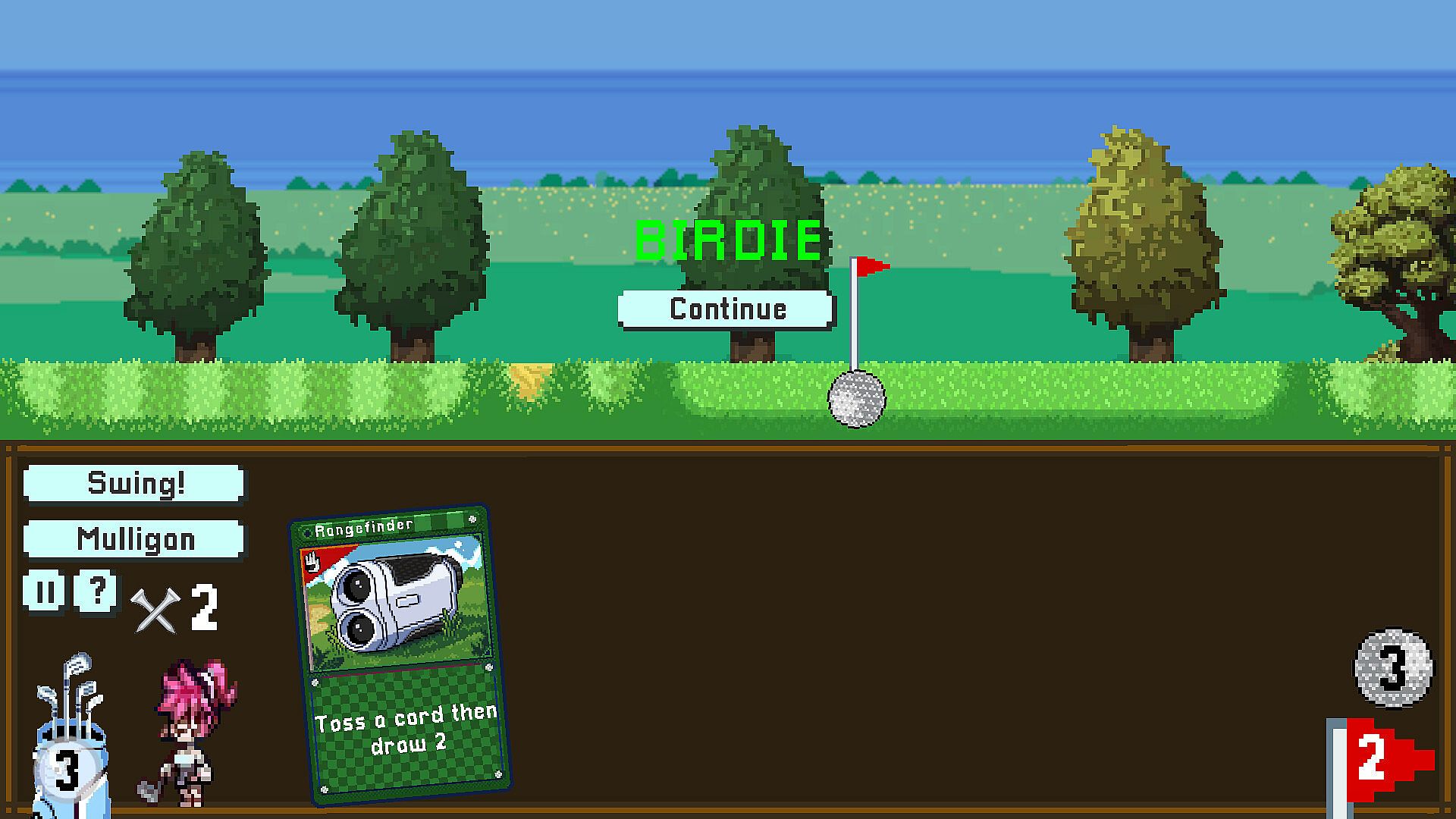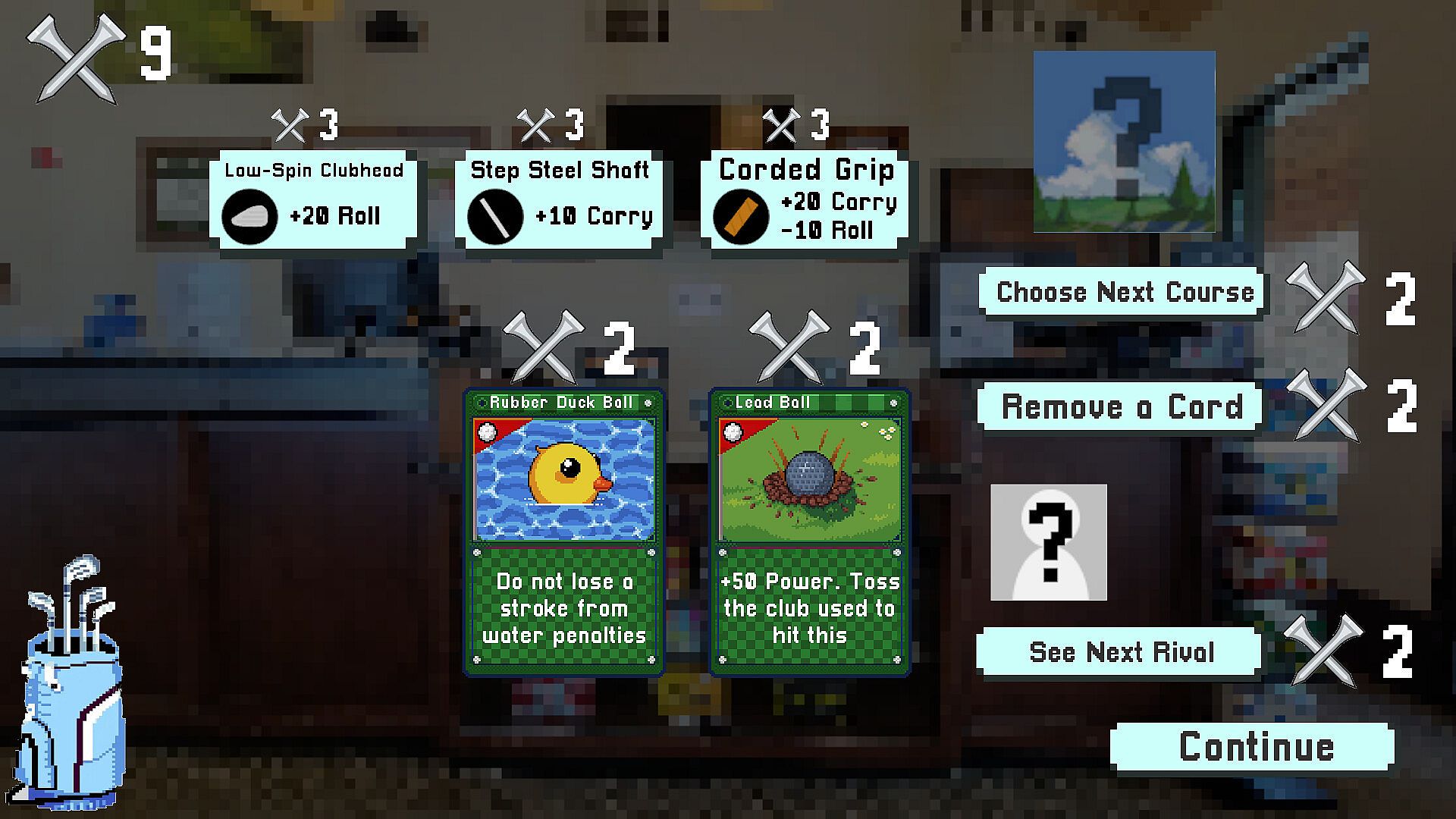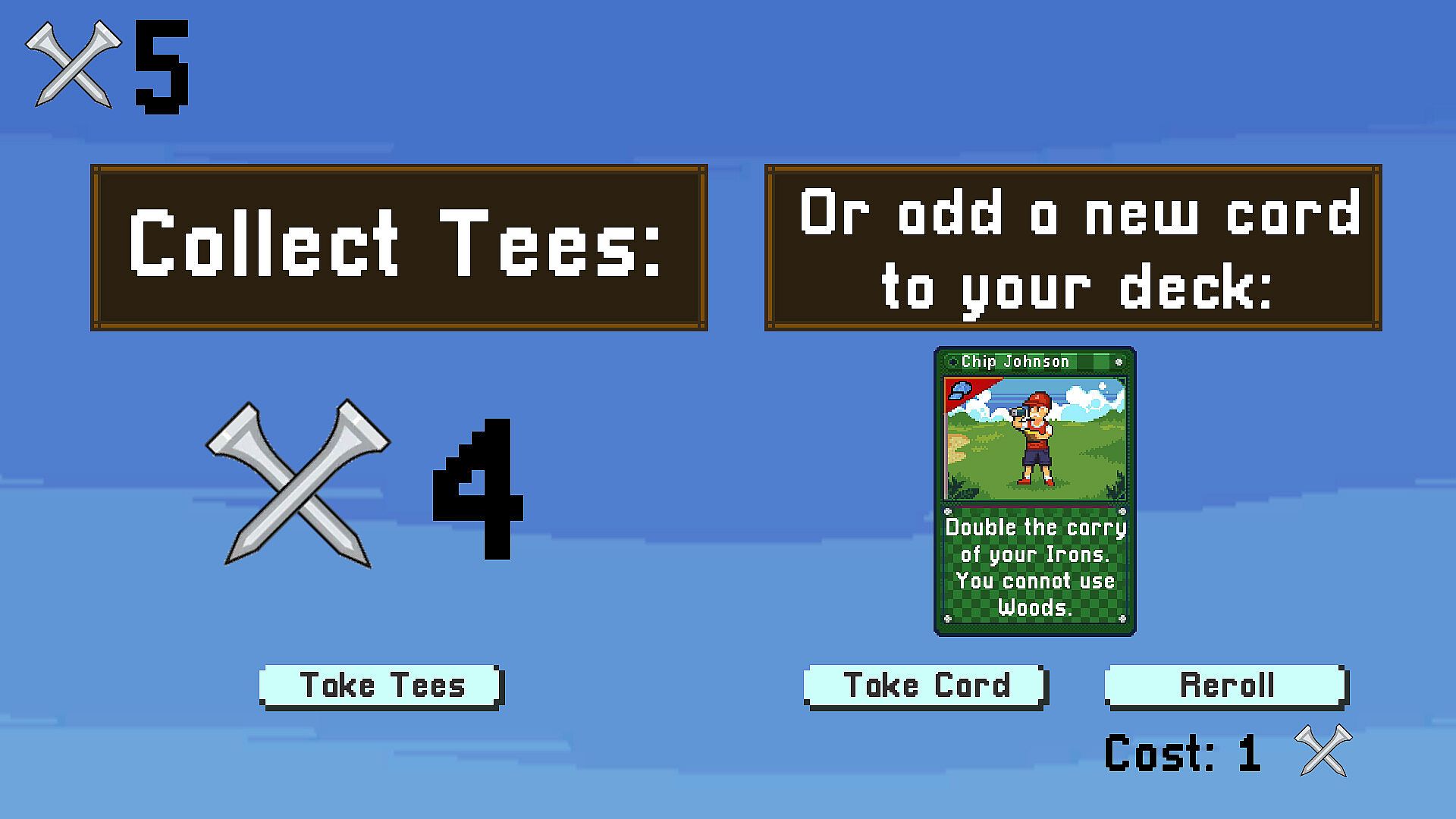 Spend your hard-earned tees between courses to upgrade cards, modify your deck, and gain info on the next course.