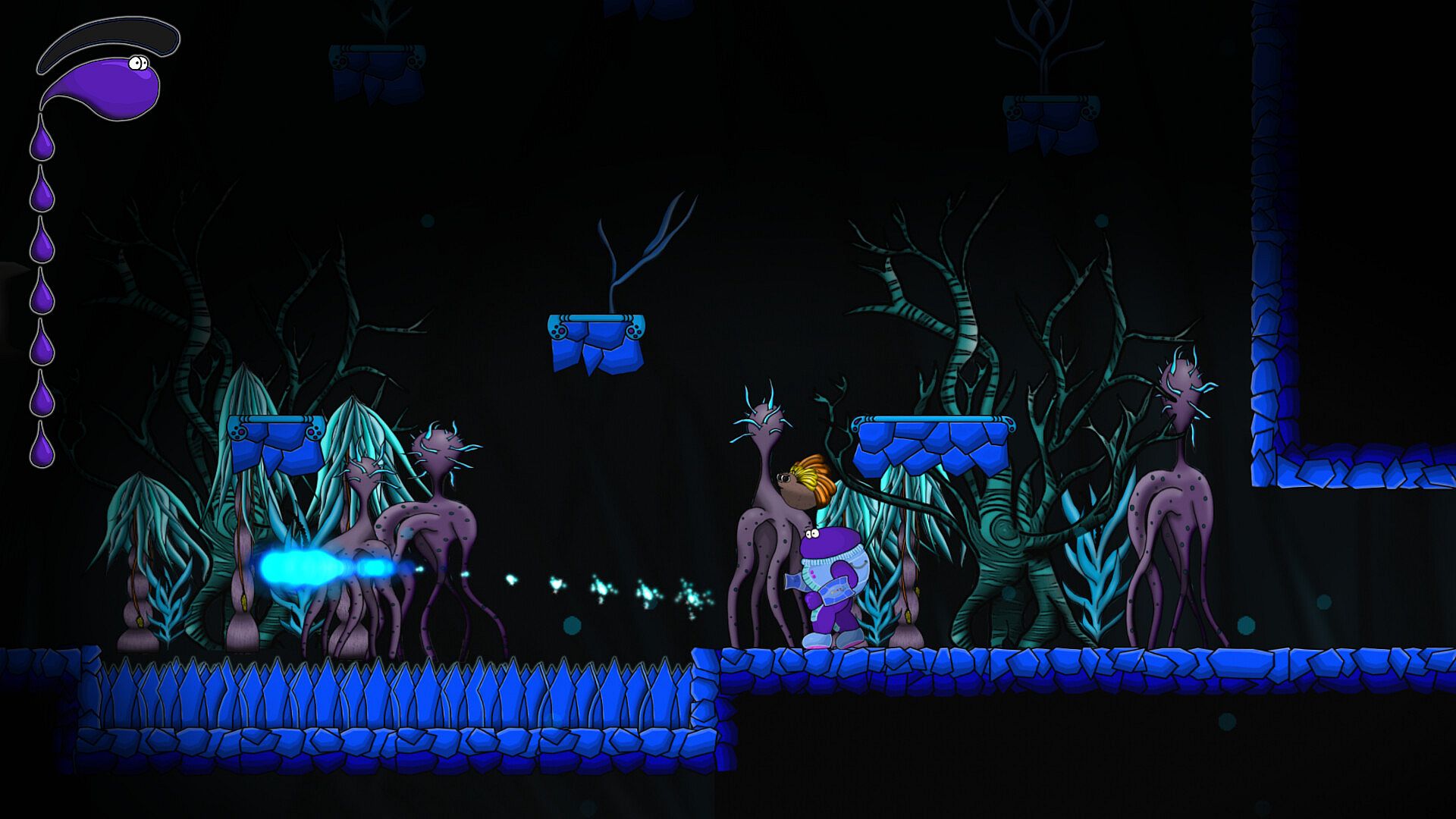 Goo Keeper offers a hand drawn semi-open world divided in multiple zones. It has multiple ways of progressing forward, where you can tackle bosses and areas in alternate order as well as bypass some altogether. The optional bosses can guard unique abilities or easier paths to another location. There are 9 primary zones within that world to explore.