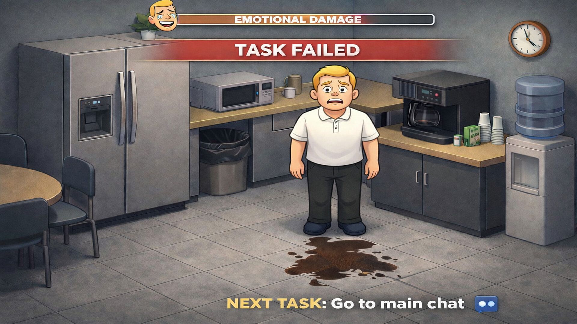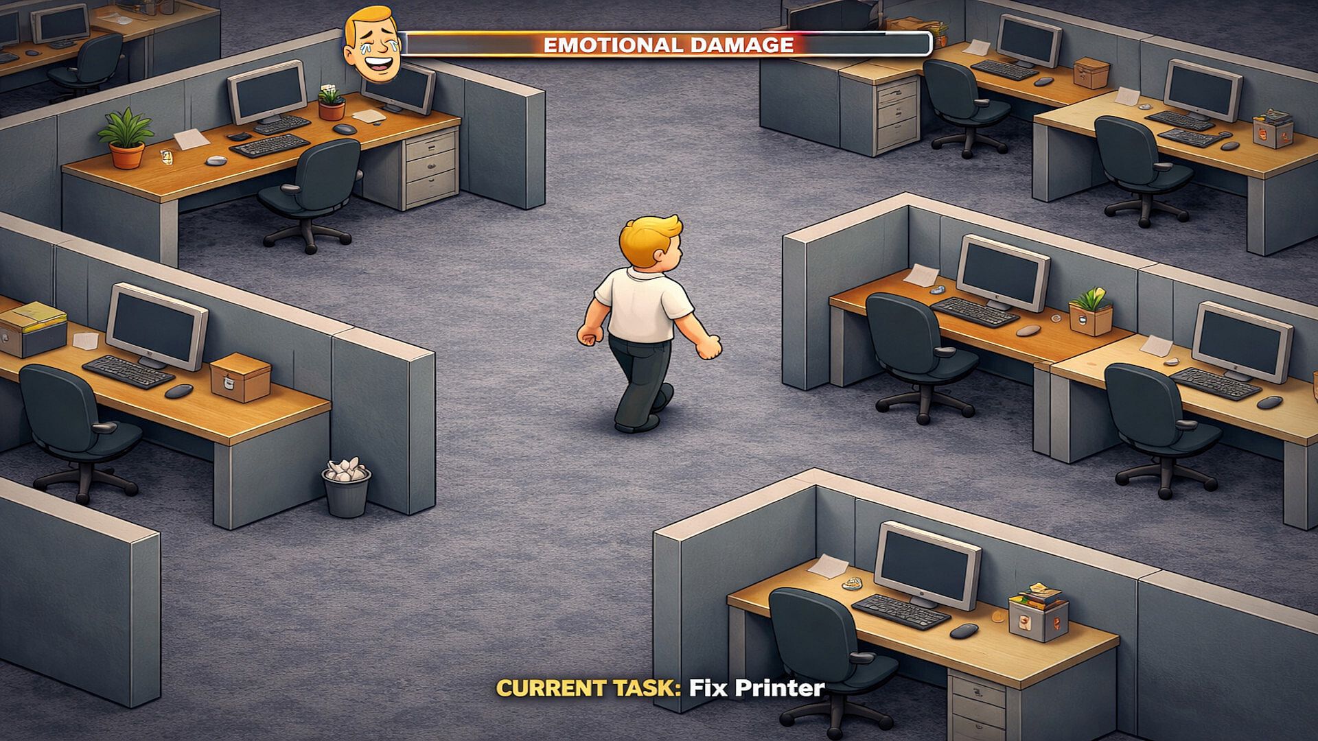 You play as Brent, an office worker lost in a maze of cubicles, deadlines, and cheerful surveillance. You are given a list of tasks to complete within each day. Tasks never stop. Time is never enough. Your performance is monitored by Main Chat and the Chatvisor; unseen systems that guide you, reassure you, and insist everything is going perfectly.