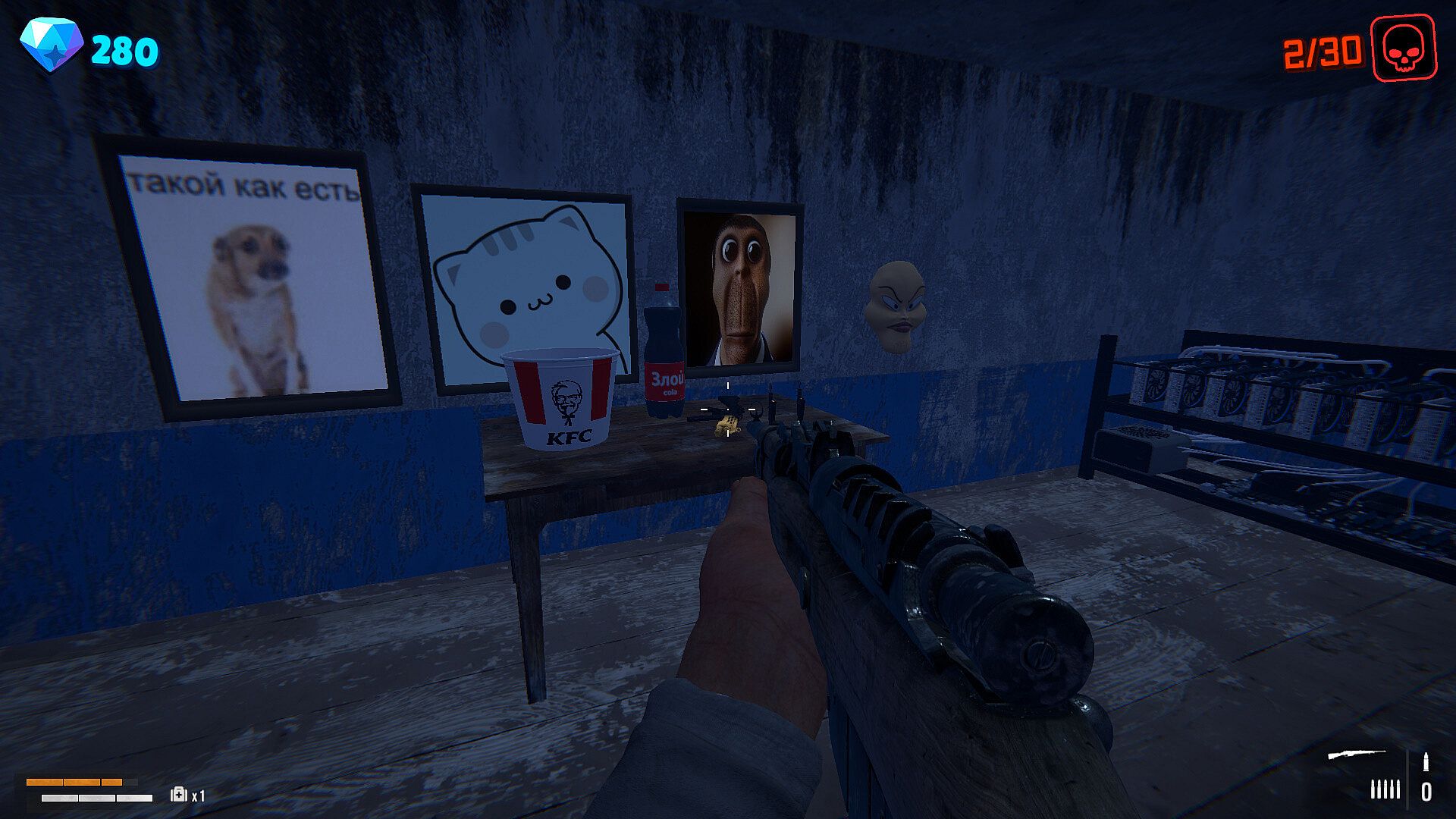 GOP STOP AUTO – This is a dynamic first-person shooter in which you will exterminate hordes of evil memes. You appear in a large, open for exploration arena and in fact you just need to quickly get to your car to get out of here, but you will not be able to open the door to the garage until you destroy 30 opponents. Evil memes are everywhere. They are thirsty for your blood. They will pursue you wherever you go. Use a wide arsenal of firearms to get rid of these annoying entities from the lower Internet. Get diamonds for destroying memes and open new levels!