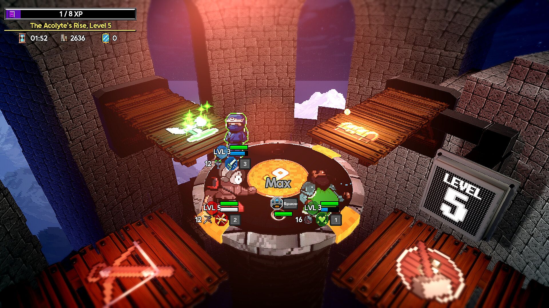 Up to four heroes ride on a giant shield in a tower in their quest to vanquish the mighty gorgon Medusa. Fight, heal, gain treasure, rise upwards. Each hero will eventually fall and make their way for the next heroes, but their sacrifices will not be in vain - for their treasure will pass onto the next, paving the way forward ever onward.