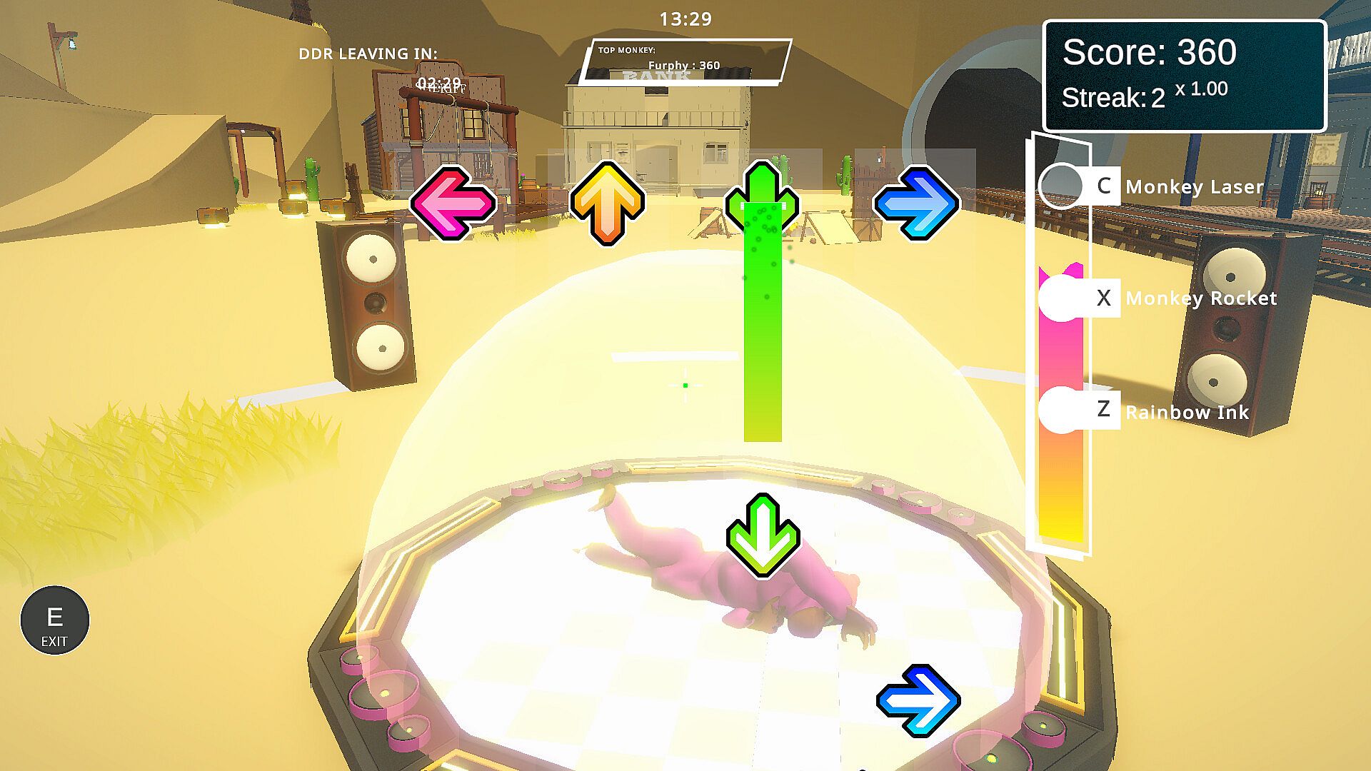 Taking the beat is your goal. Stand on the pad, match the rhythm, and rack up points - but staying alive is half the battle. The dance pad has new power-ups every round, letting you launch missiles, bend time, or laser down rivals in unpredictable musical mayhem.