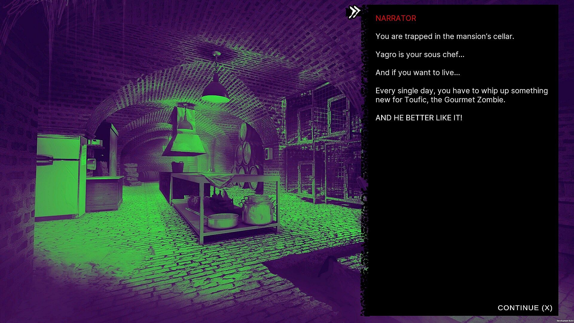 In the wake of the zombie outbreak, you’re one of the last surviving humans—but survival comes at a cost. Imprisoned in a mansion’s cellar, you’ve been forced into the service of Toufic, the Gourmet Zombie. Once a bon vivant, Toufic is now a mort vivant with a refined taste for the macabre—and you’re his personal chef.