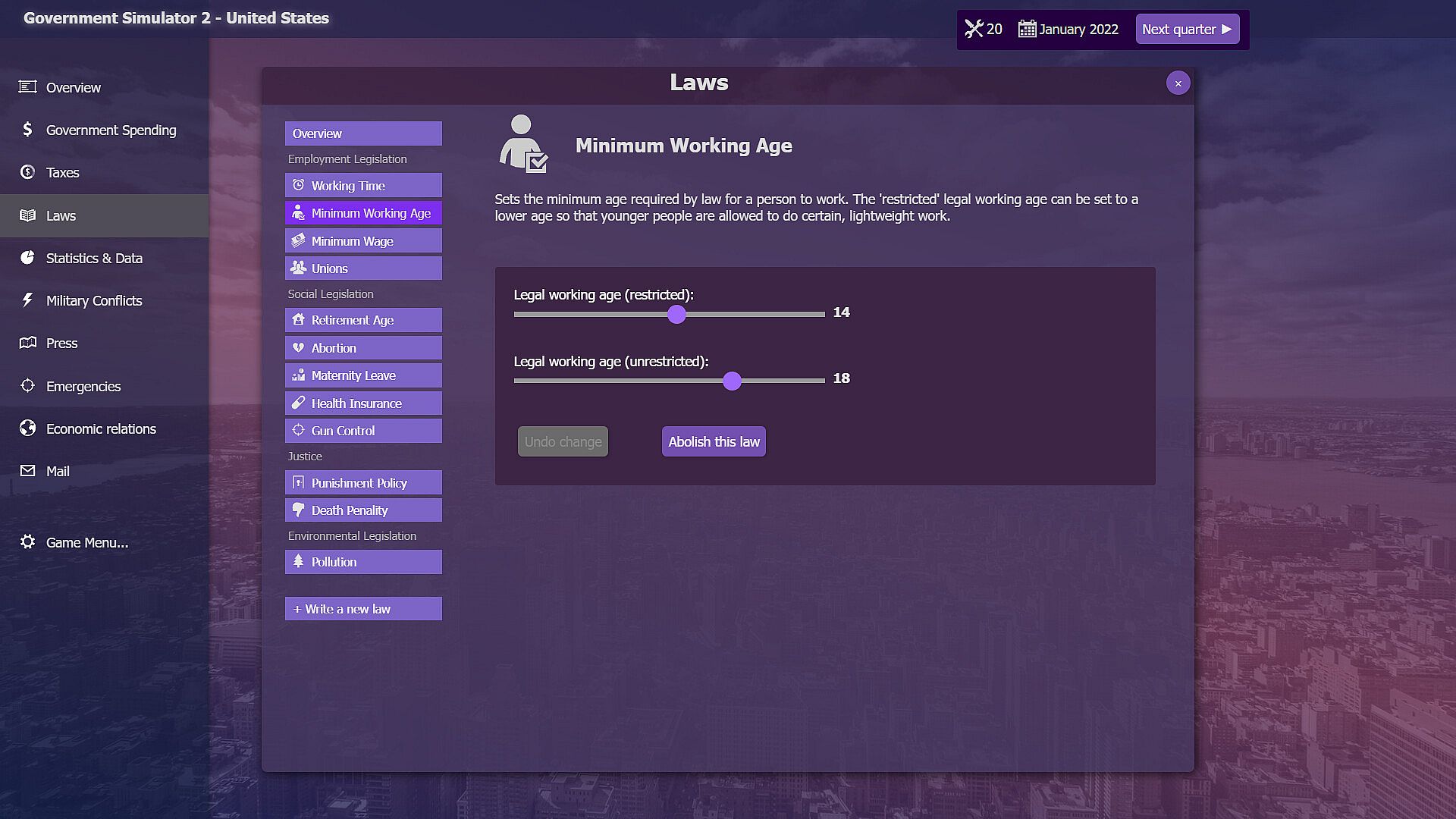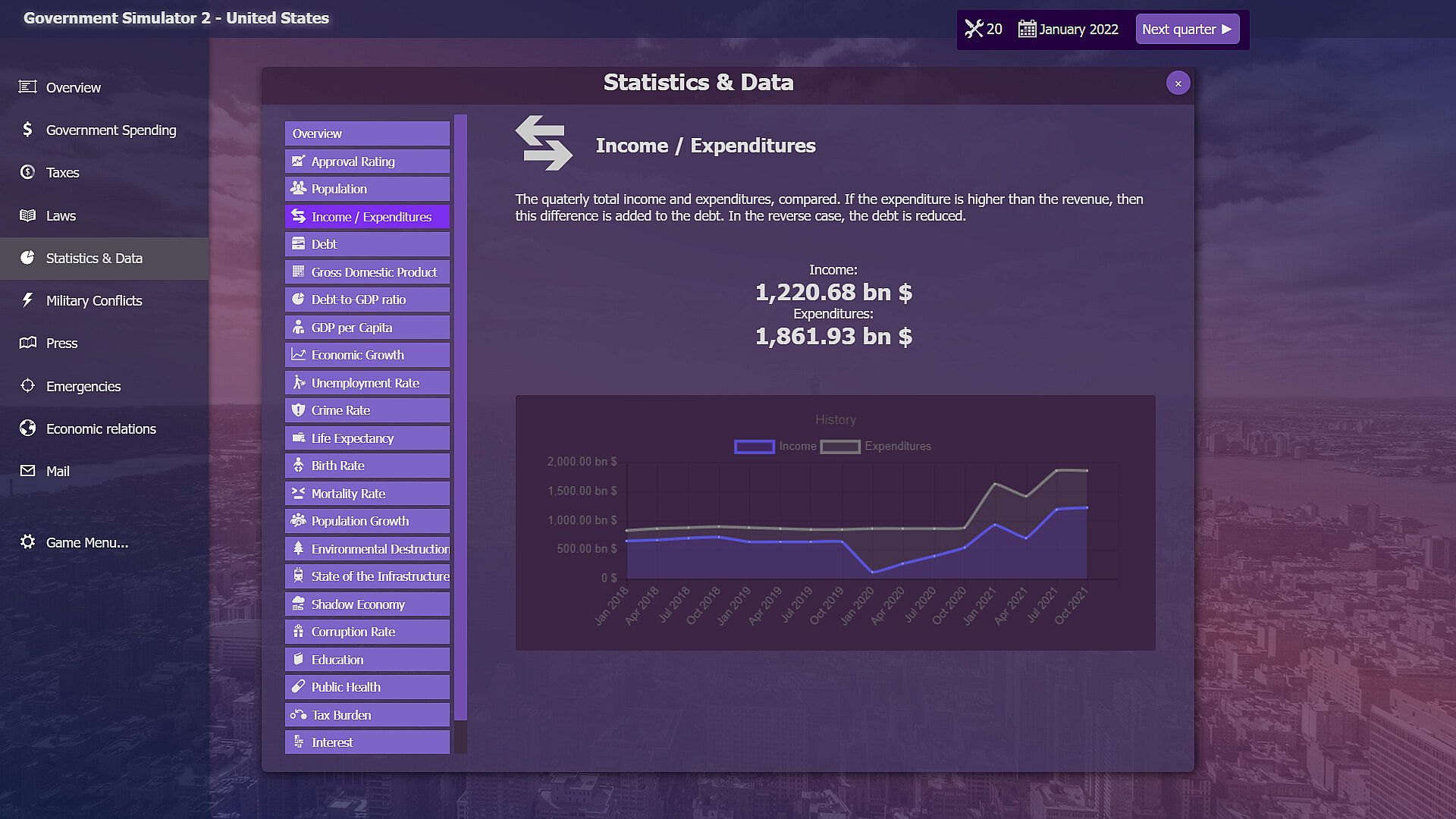 In Government Simulator 2, the core experience revolves around managing a country's key metrics, such as population, debt, unemployment, and infrastructure. You start with authentic starting values for nations like the USA or Germany, then adjust elements like tax rates or budgets to see direct effects on statistics, including economic growth or life expectancy. The simulation engine handles complex interactions, so changes in minimum wage might influence unemployment or public health ratings.