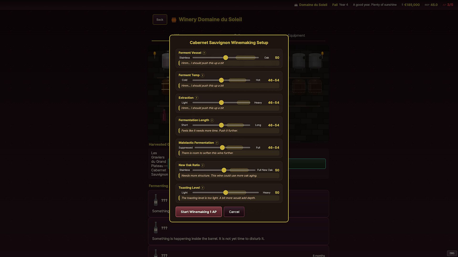 Fine-tune every batch with 7 winemaking sliders: ferment vessel, temperature, extraction, duration, malolactic