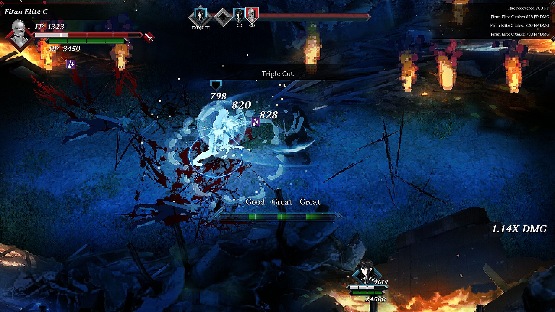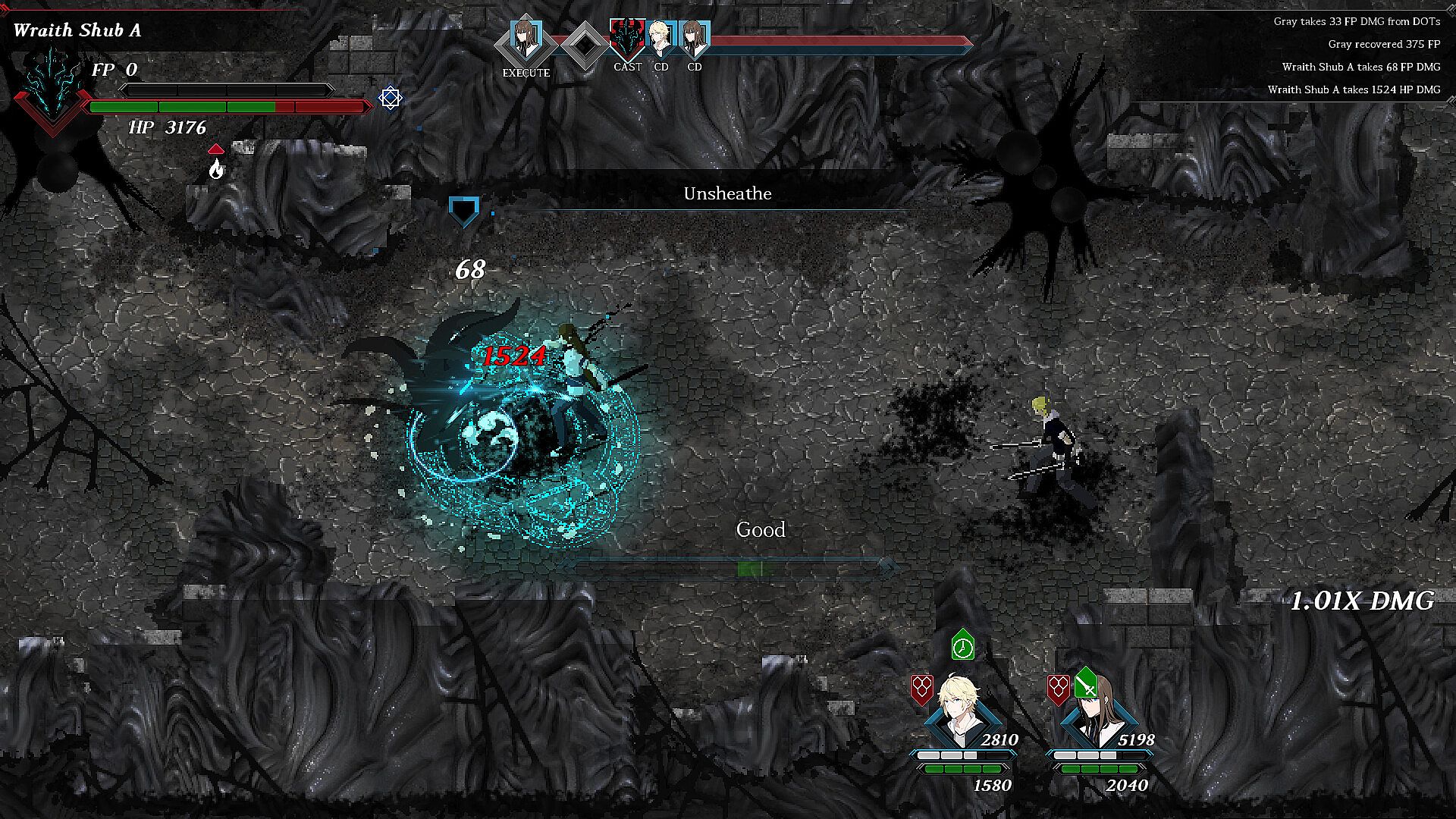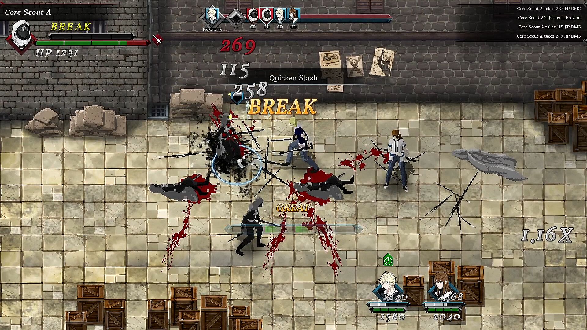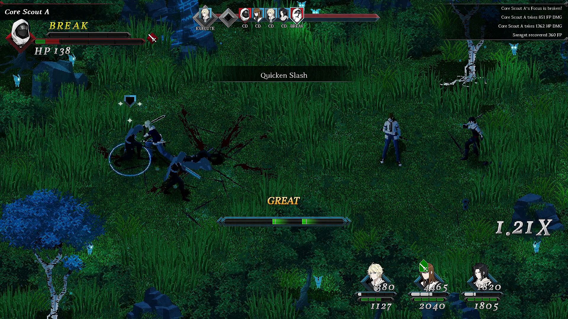 Featuring a unique turn based battle system centred around Focus management. A quick and responsive system without healing, where status effects and exploiting openings is the key to victory. Use the active timing system to both increase your offensive power as well as block or even parry incoming attacks, or allow the dice to take control of these outcomes. Build your combo increasing the damage of the entire party with good timing, and gather Burst to allow one of your party members to unleash a chain of directional attacks to release their devastating finishers.