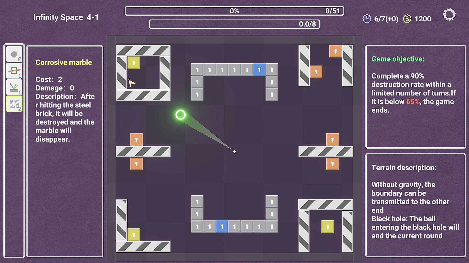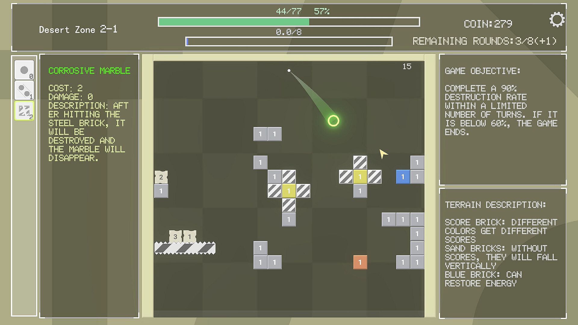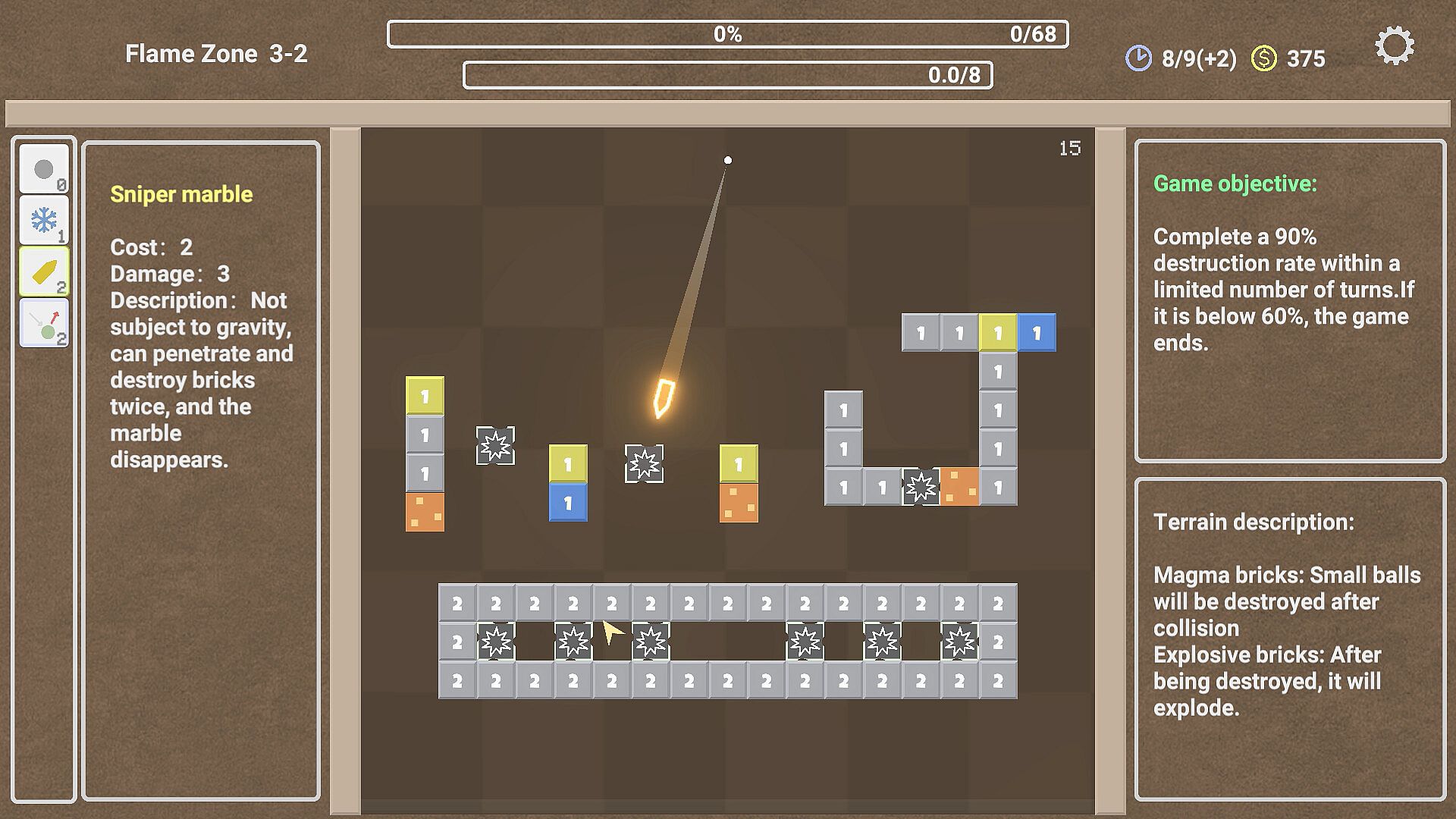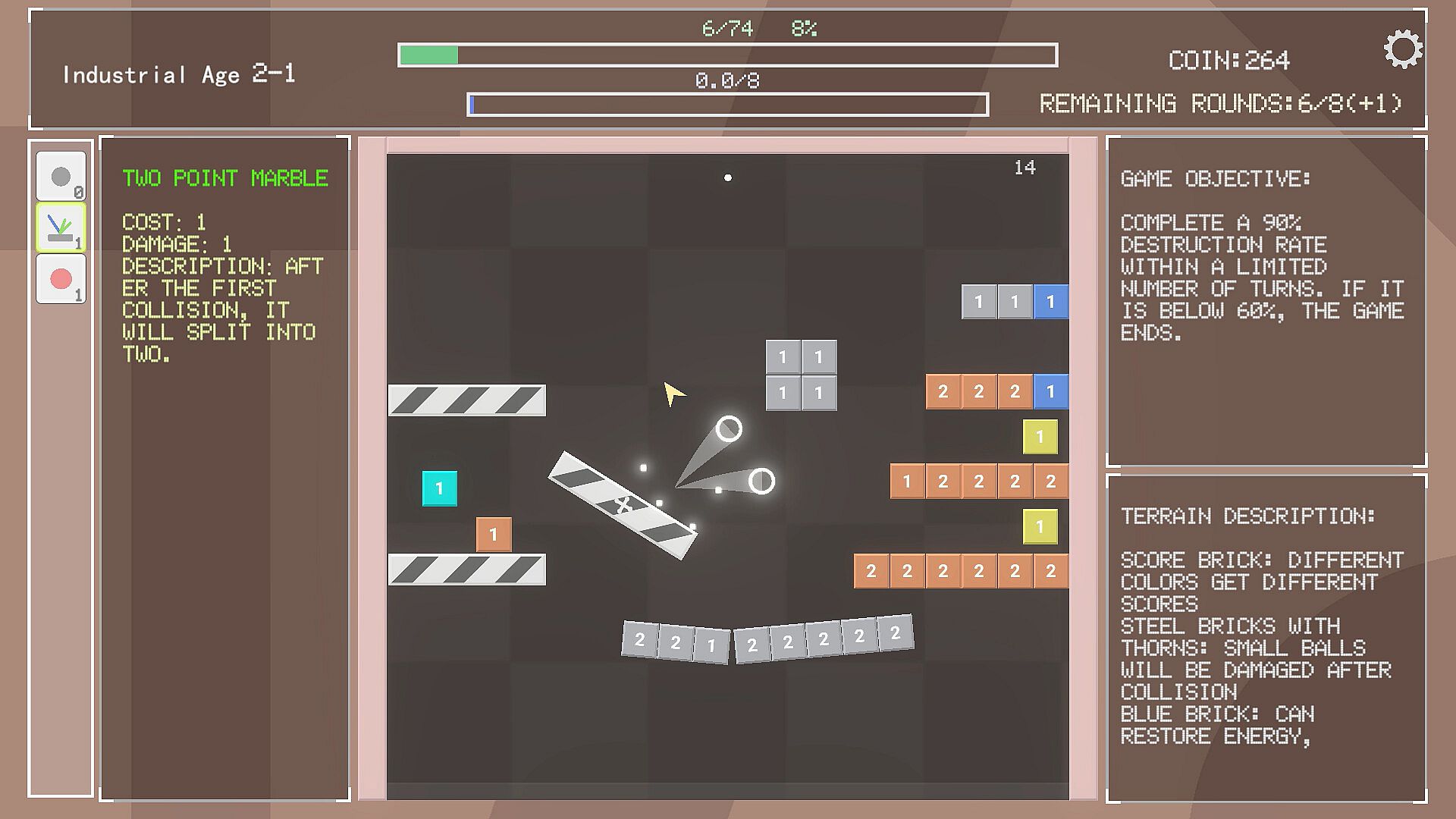 This is a game of marbles hitting bricks. Reasonably utilize various marbles and plan energy values to achieve more destruction rates within a limited number of turns.