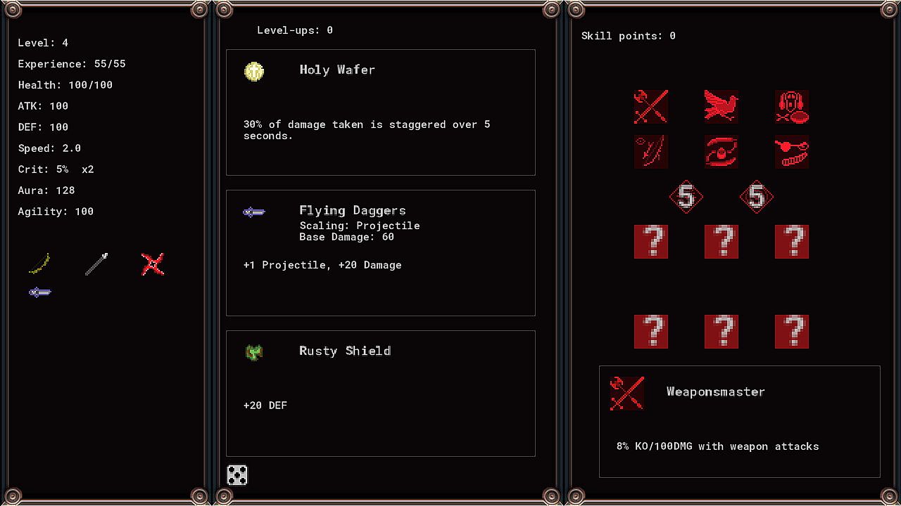 Levelups in Gravepact do not constantly interrupt your gameplay the way they do in most Survivor type games Open up your character screen at any time to spend your level-ups on new weapons, items and upgrades, as well as improve your skills. A + sign on your portrait will let you know if there is something new to be gained.