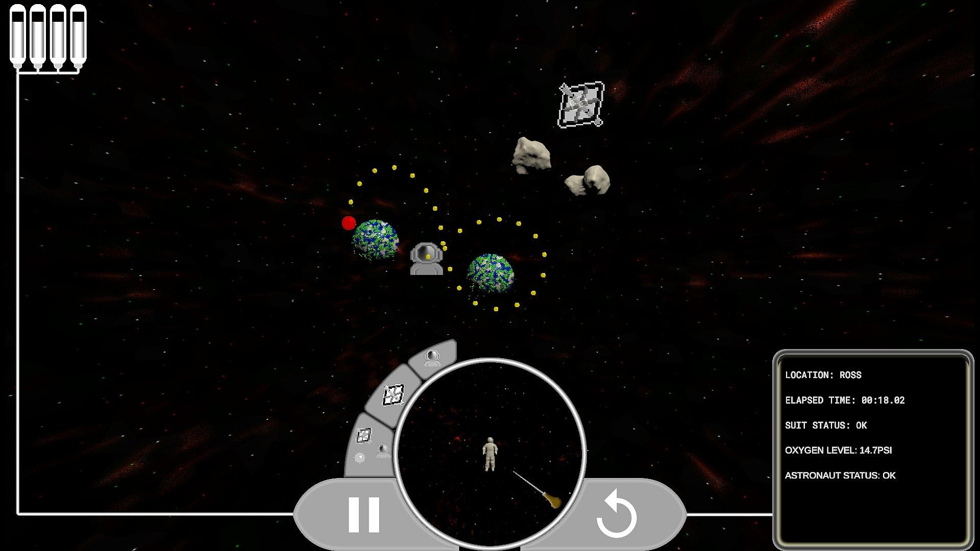 It is puzzle game about unlucky astronaut that got stranded in the orbit near some planet. He has no convenient way to move himself to the space station nearby and air reserve will not last for long. But he got an idea - if he poke a hole in his suit in just right direction - force generated by air leaving the suit can push him right to the lifesaving station. He just need you to show him a right direction and his life will be saved. Well.. until he find himself stranded in other orbit (he doing that a lot, lately).