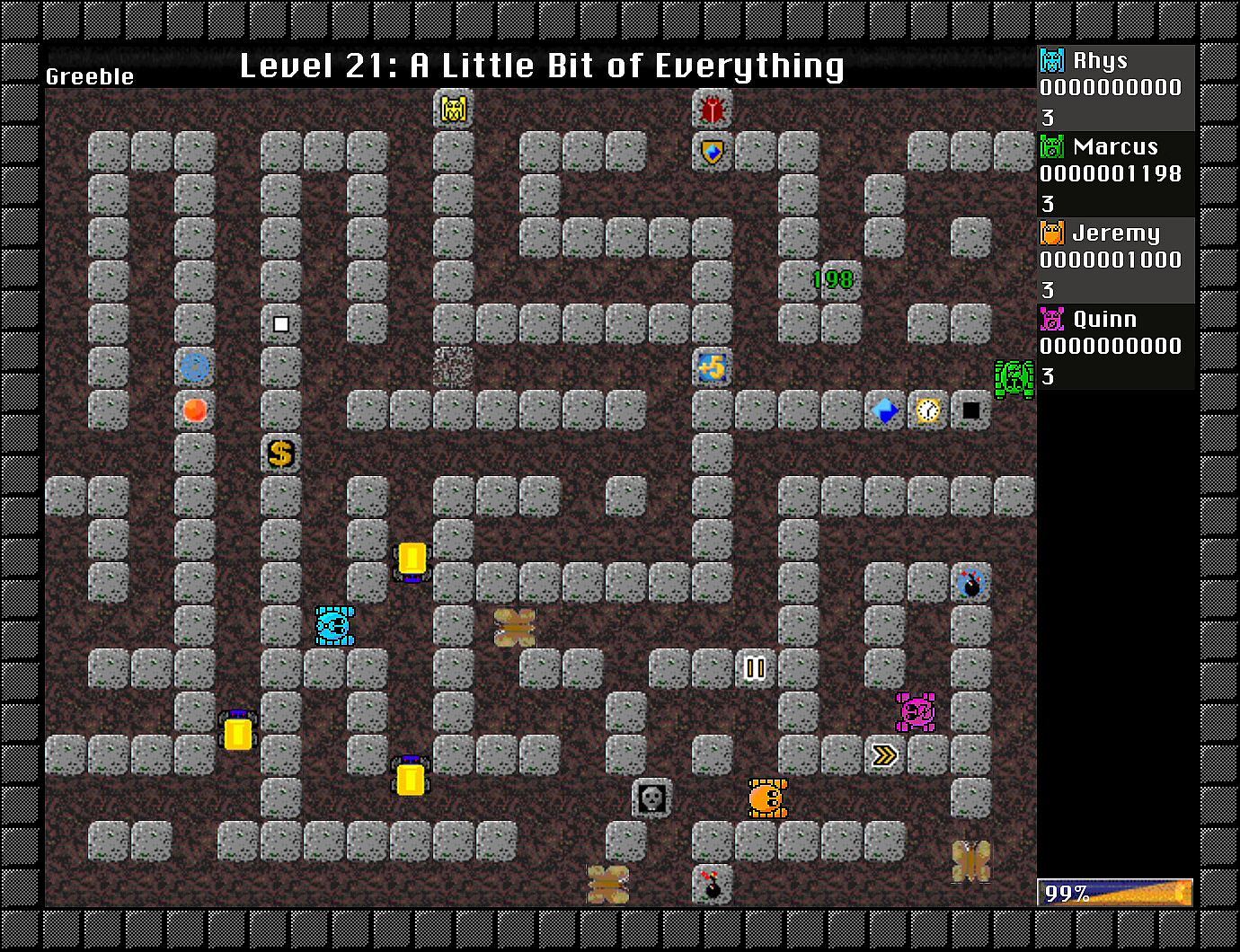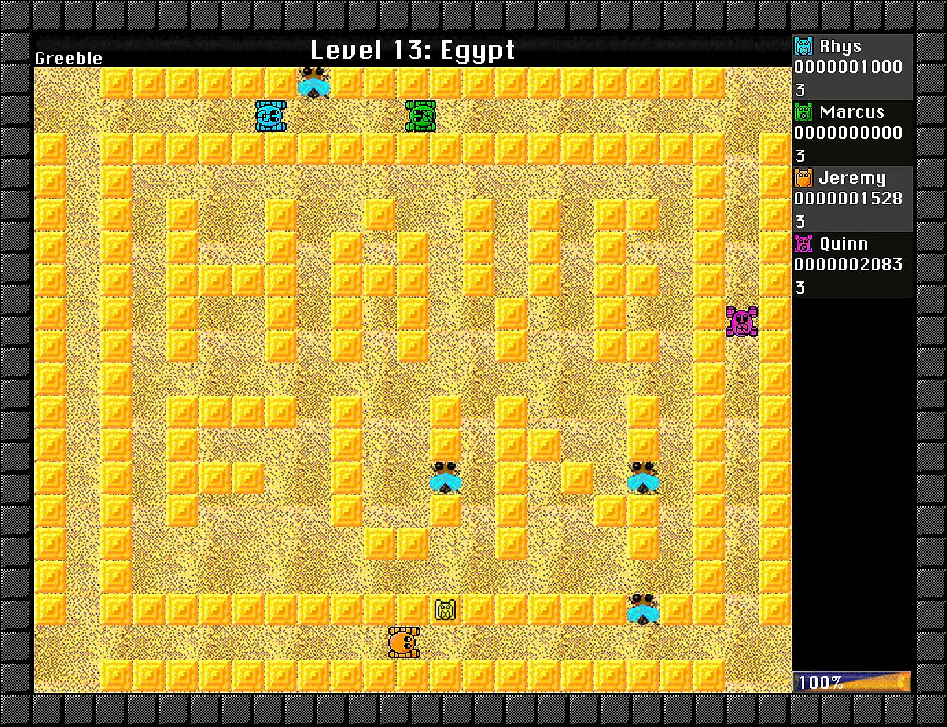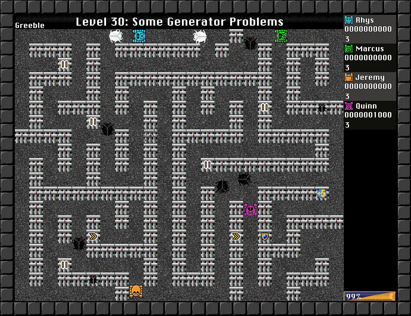 Gameplay progresses to the next level when all greebles and greeble generators have been destroyed.
