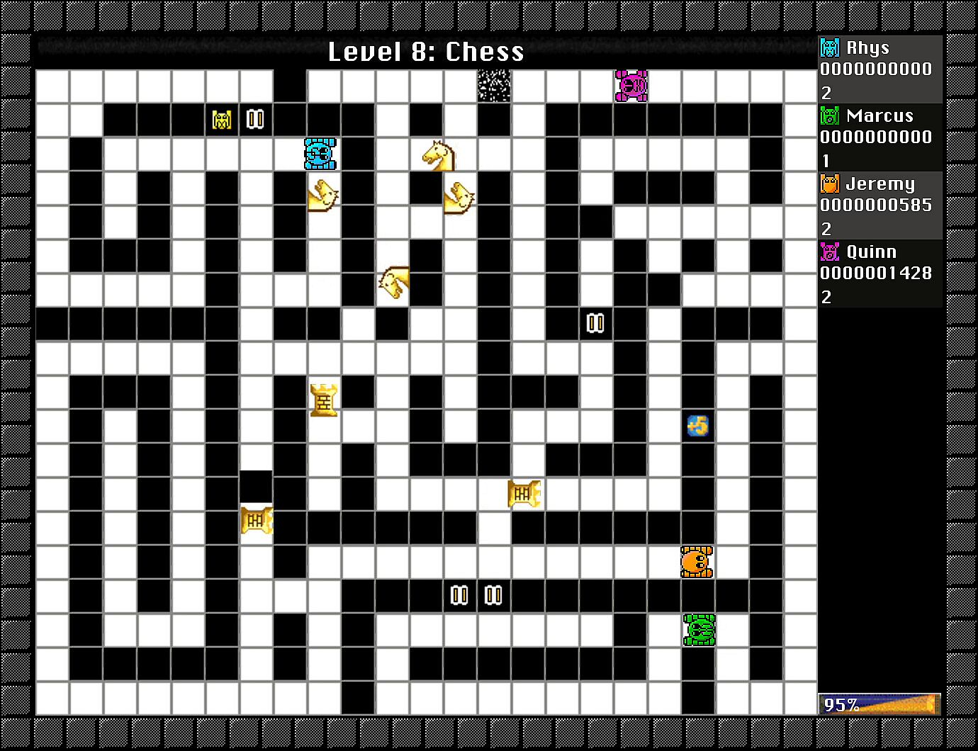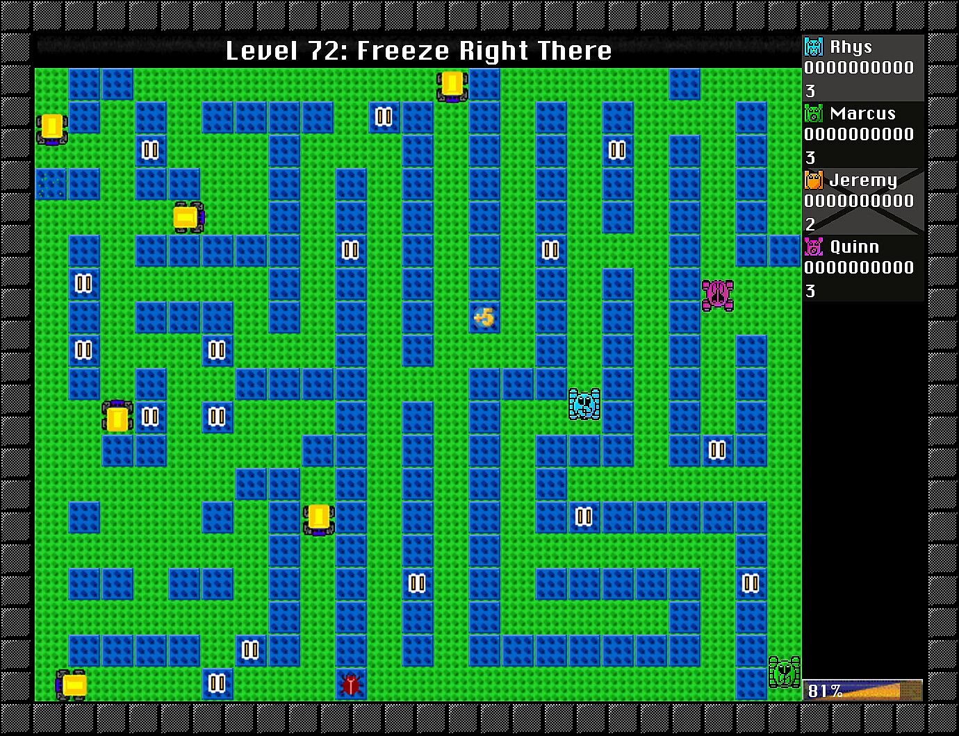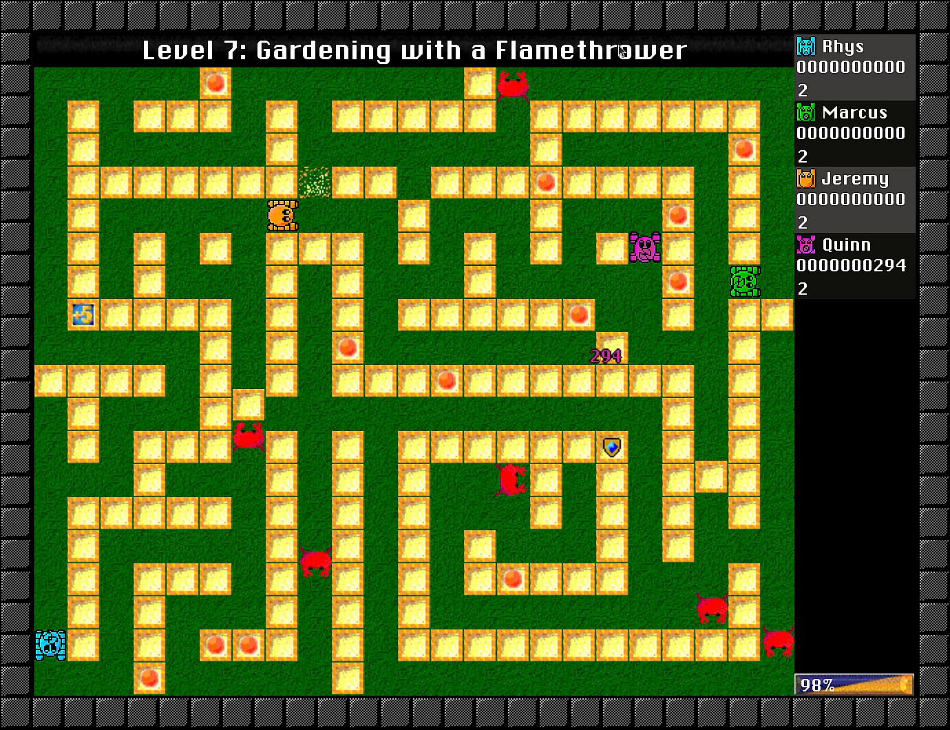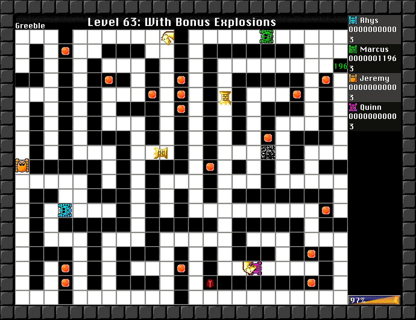 Crush cockroaches and fish with bulldozers in this action-packed indie maze game. Players push blocks to slide them across the playfield, timing moves to scoop up Greebles for points while dodging their touch. Special blocks add strategy: grenades explode to clear areas, generators spawn more foes until surrounded or crushed, and buffs like shields or freeze effects shift the chaos. Solo players tackle 100 levels across three difficulties, destroying all Greebles and generators to advance. Local PvP or co-op fits up to four on one PC, while LAN connects nine machines for 36-player matches. Casual gamers and multiplayer fans thrive on the skill-based block-pushing frenzy.