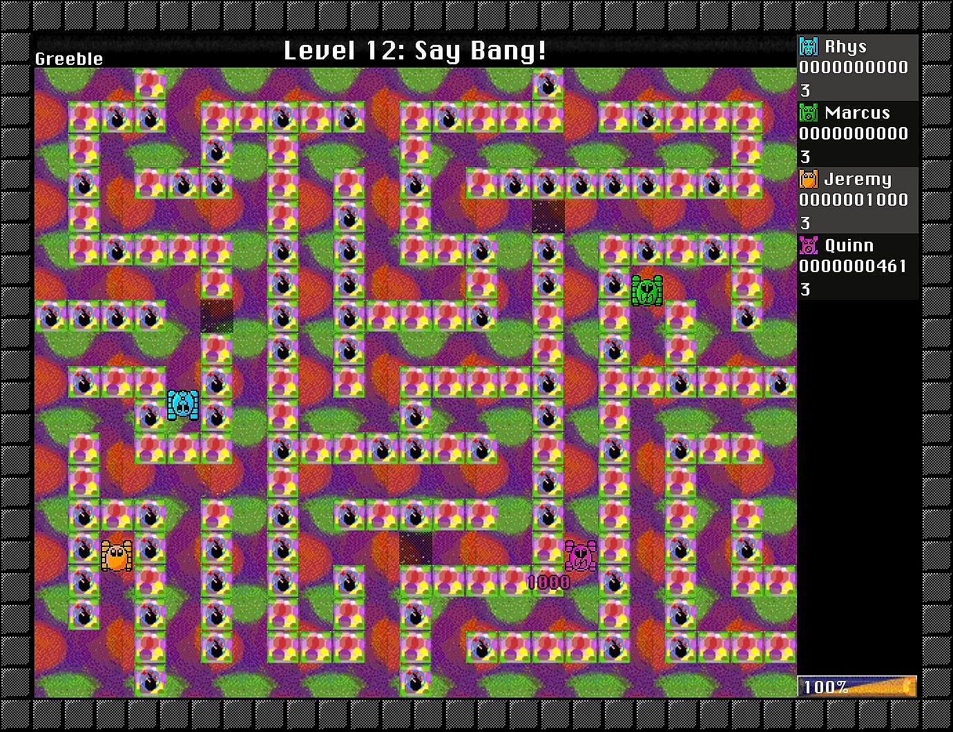 While fun to play solo, Greebles becomes much more fun with friends. Up to 4 players can play (PvP or co-op) on a single machine, although it can get a bit crowded around the keyboard! Up to 9 machines (any platform) can connect for LAN play, for a total limit of 36 players per match!