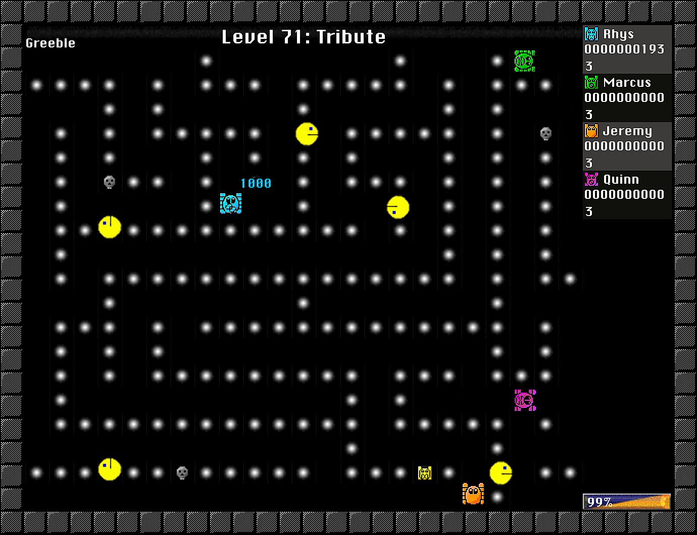 Greebles is an action packed game of skill involving bulldozers, cockroaches and fish. Players attempt to navigate a maze of blocks while crushing Greebles to gain points. The more Greebles you crush, the more points you get! Just don't let them touch you!
