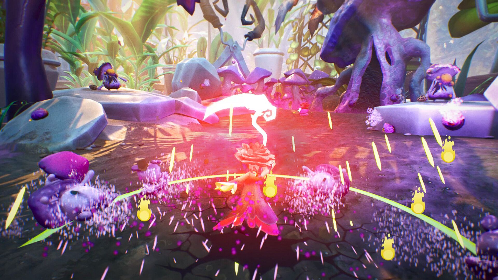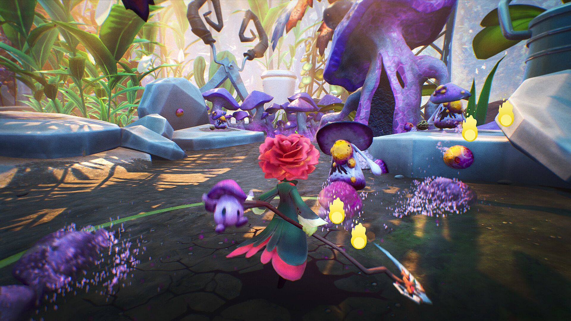 Play as Rubin, a rose ensorcelled by the goddess Antheia and entrusted with her sacred scythe. Mushroom marauders have invaded the peaceful, prosperous greenhouse, targeting the garden goddess and choking the life from her children. It is your duty as Antheia’s chosen to traverse the expanse of the greenhouse and slay these invaders before they bleed dry your fellow fruits and flowers and overtake your home.