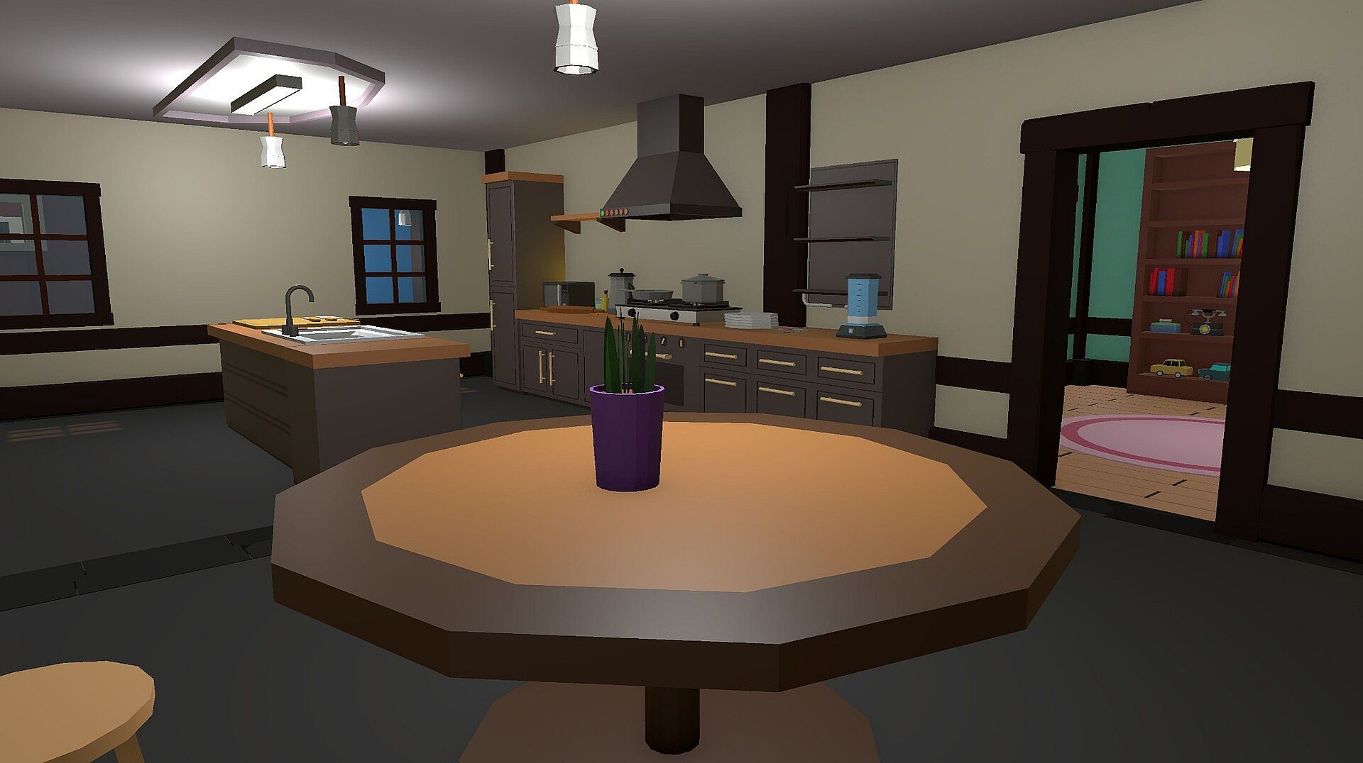 Explore a calm low-poly fantasy world filled with soft colors and a relaxing atmosphere. Frame houses, glass greenhouses, open farmland, and mountain landscapes create a space designed to help you slow down and unwind.
