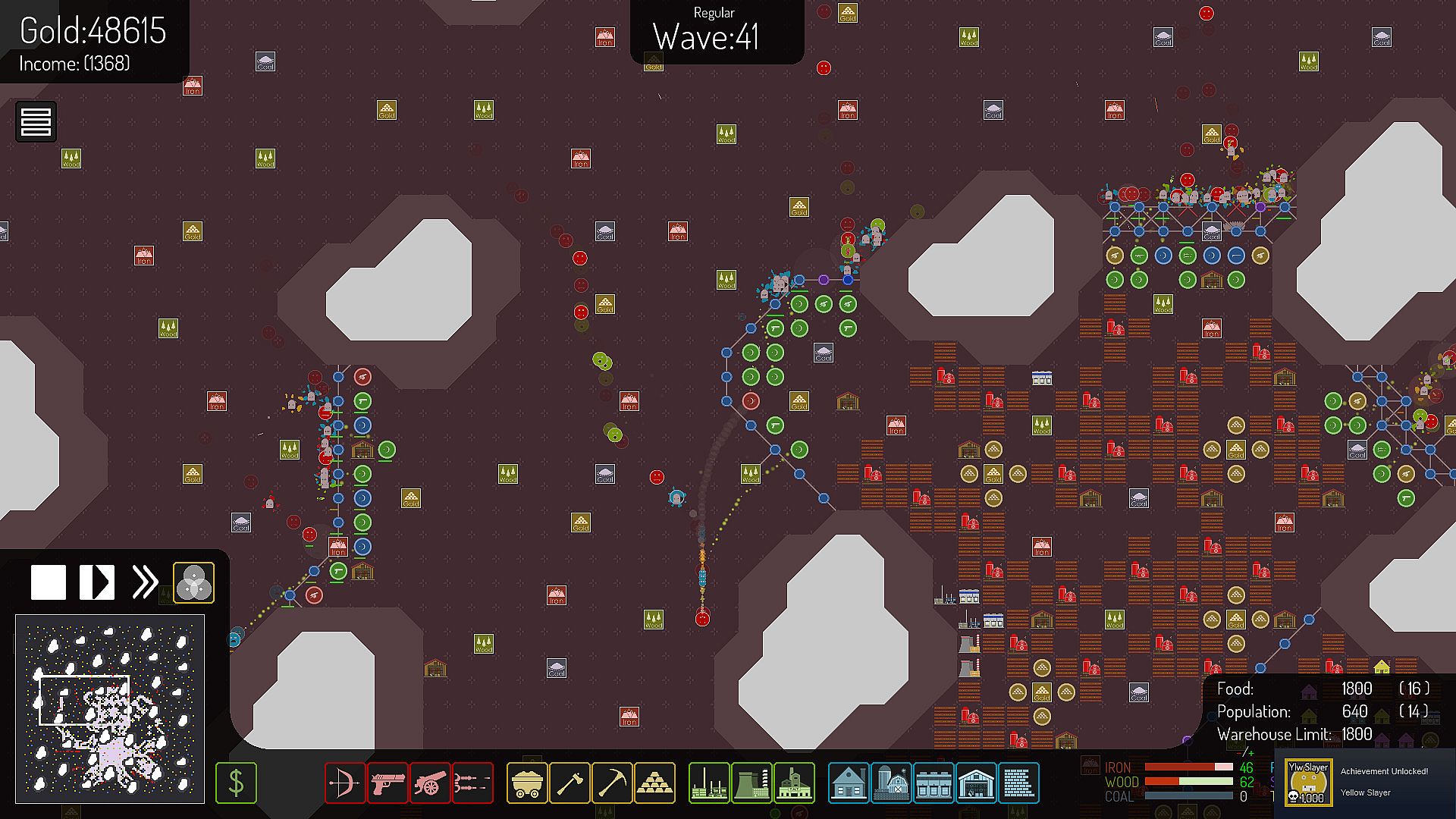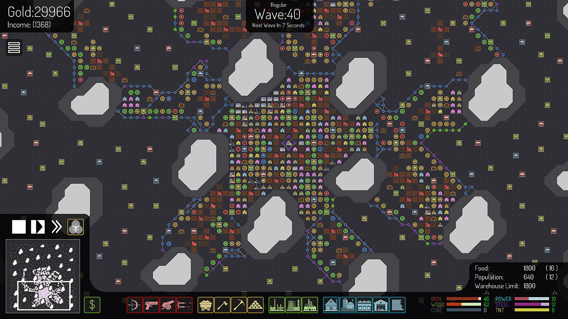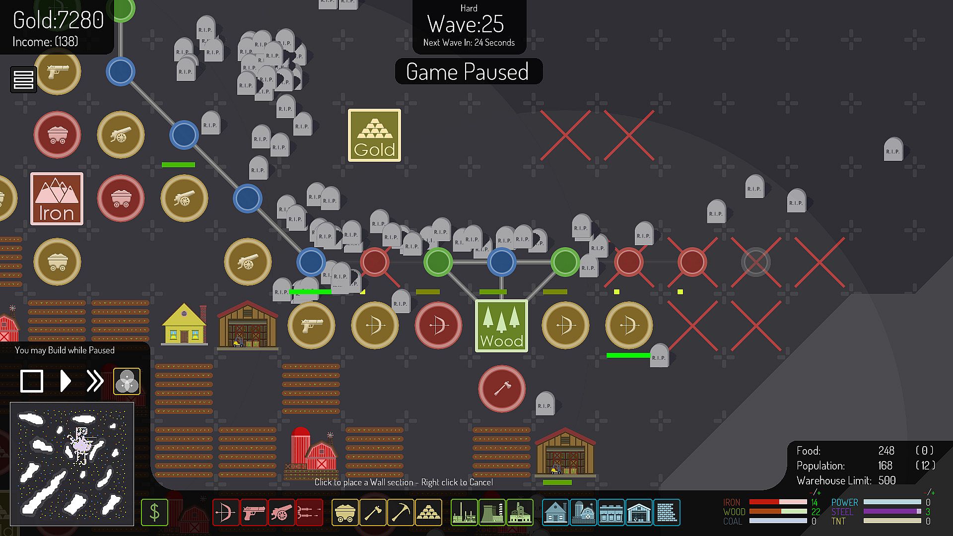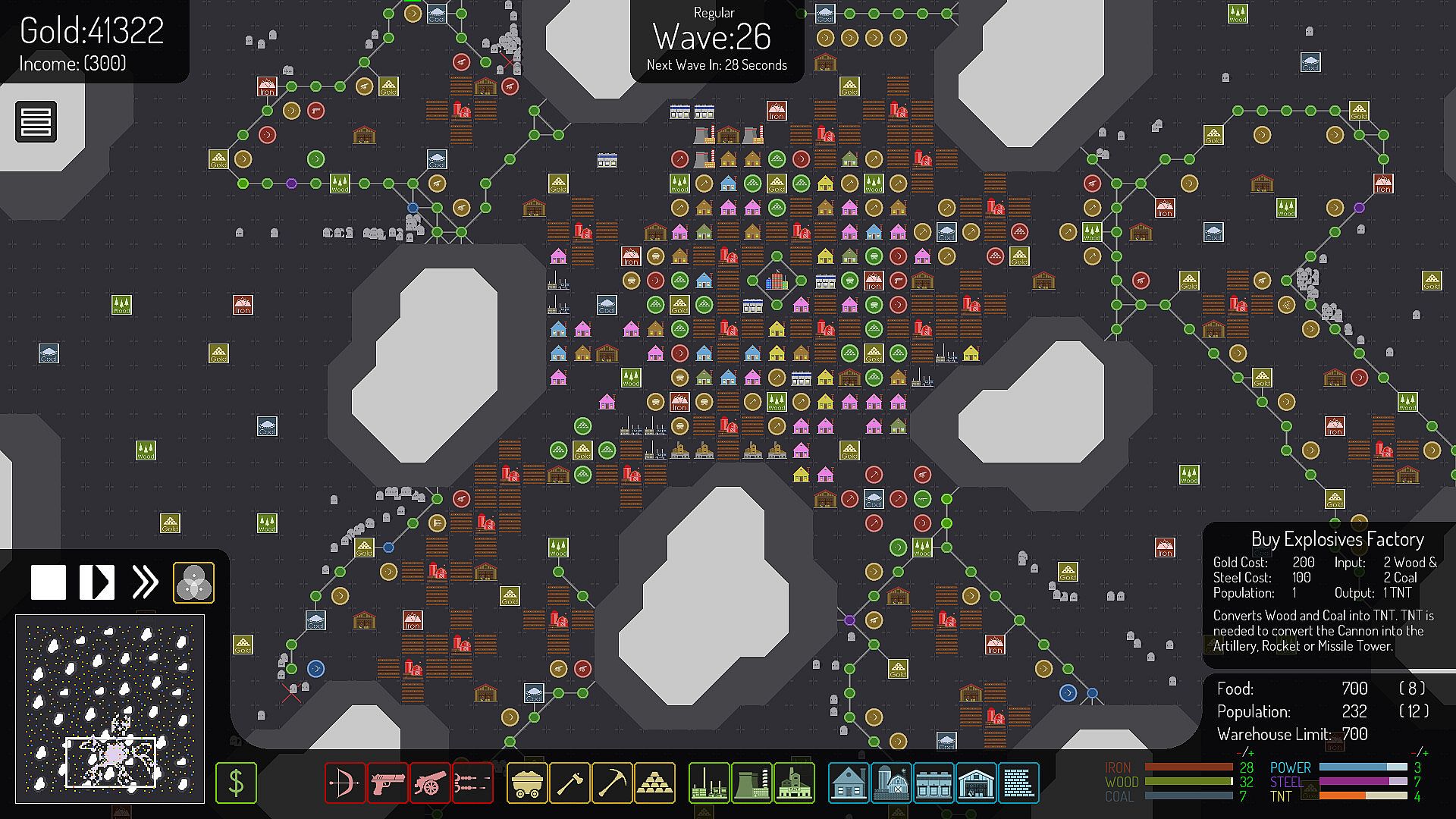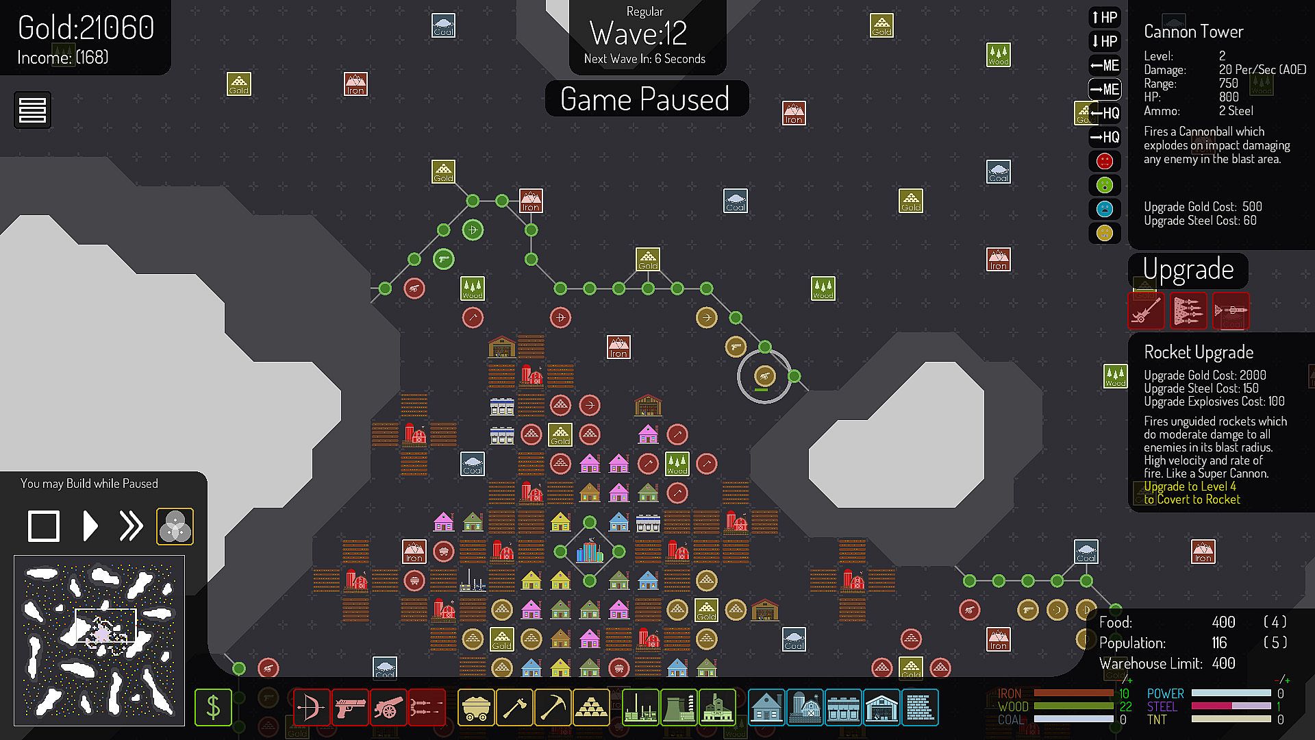 To Defend your Headquarters from Creeps you will need People to man your Towers, Mine for Resources and Keep the Production Buildings running at Top Efficiency, but your People need Food and Shelter, so you will need to build Houses and Farms as well; efficiency suffers greatly if you let your Food run out or you don’t have enough Houses!