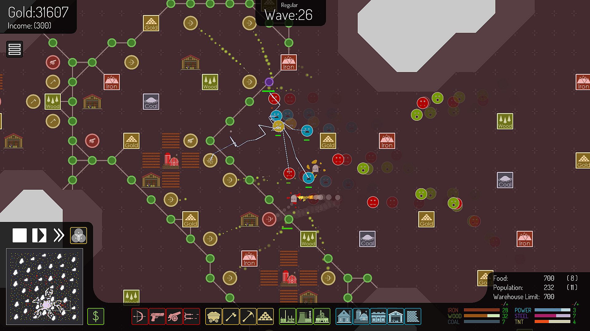Building requires Gold and Resources, but Resources also serve as Tower Ammunition, each Tower uses a different type and upgraded Towers use more- in other words; keep an eye on Managing those Resources, you don’t want to run out during an attack!