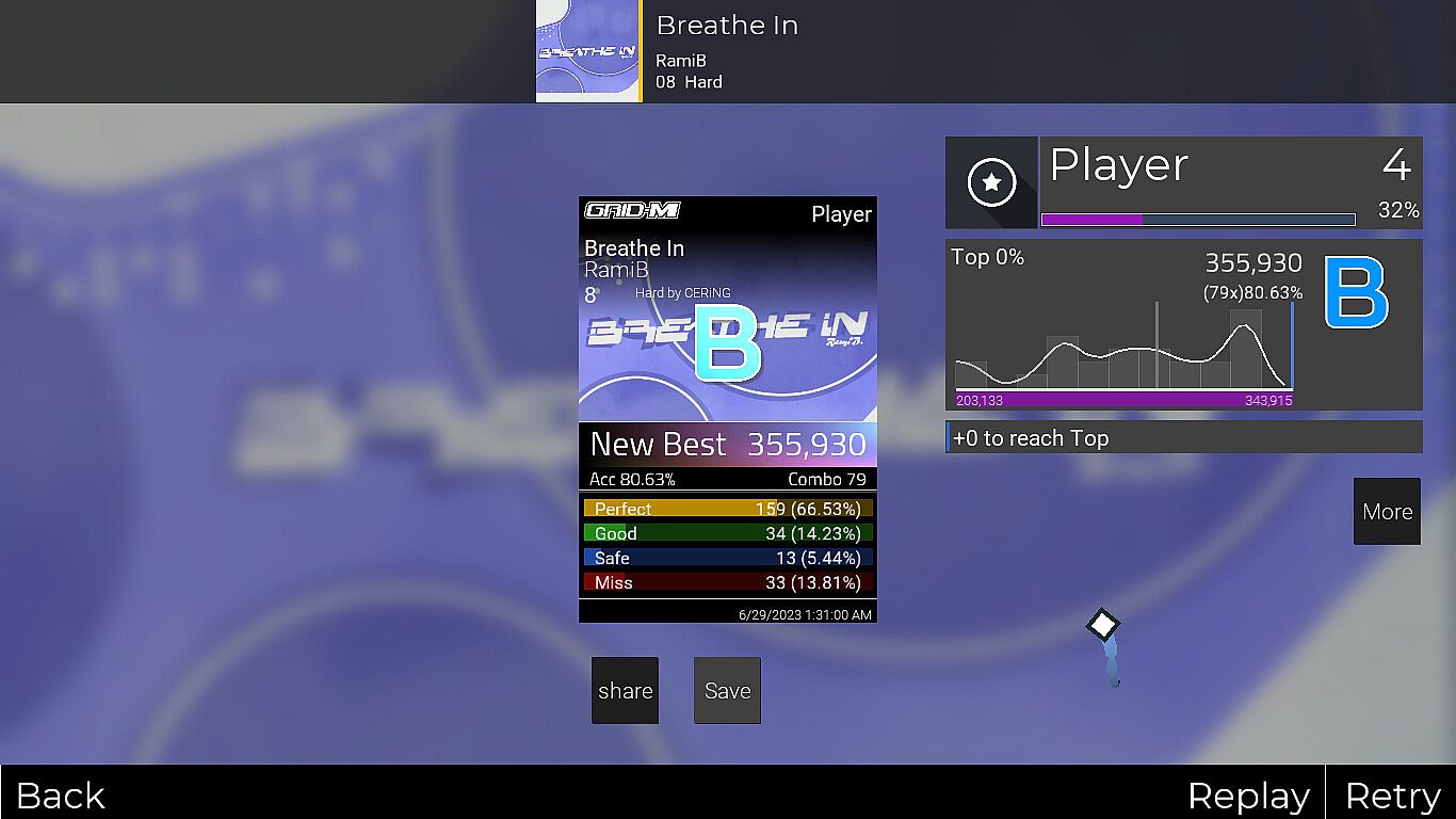 Experts at rhythm games know no bounds and neither does Grid-M. Take on up to 25 squares, on a moving and rotating grid with high BPM songs and complex patterns. And if it’s not enough, there are Modifiers to further increase the difficulty or just go wild.
