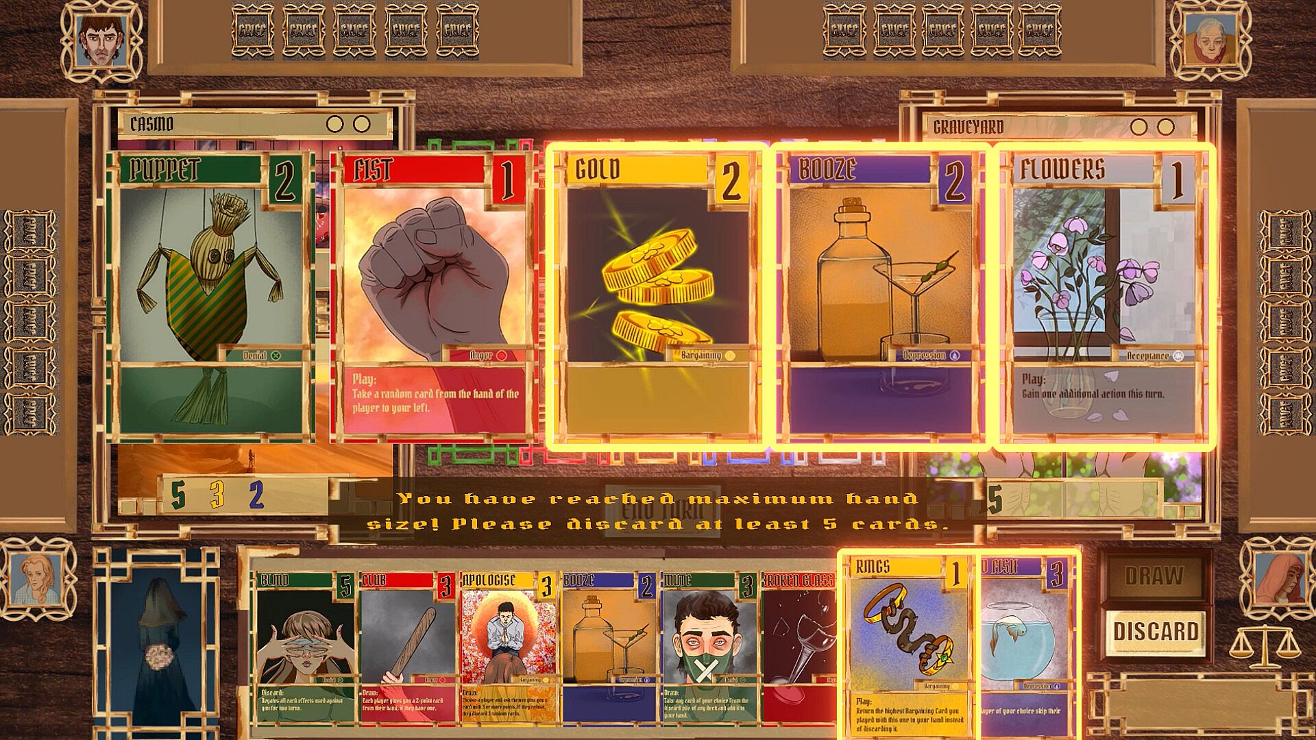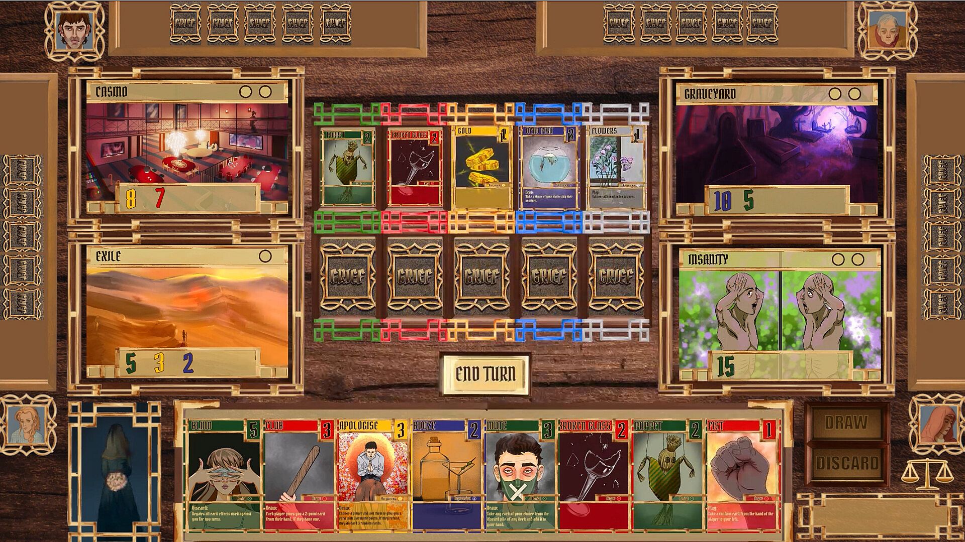 Grief is a competitive, turn-based digital board game for 2–5 players, focused on card play and hand management.