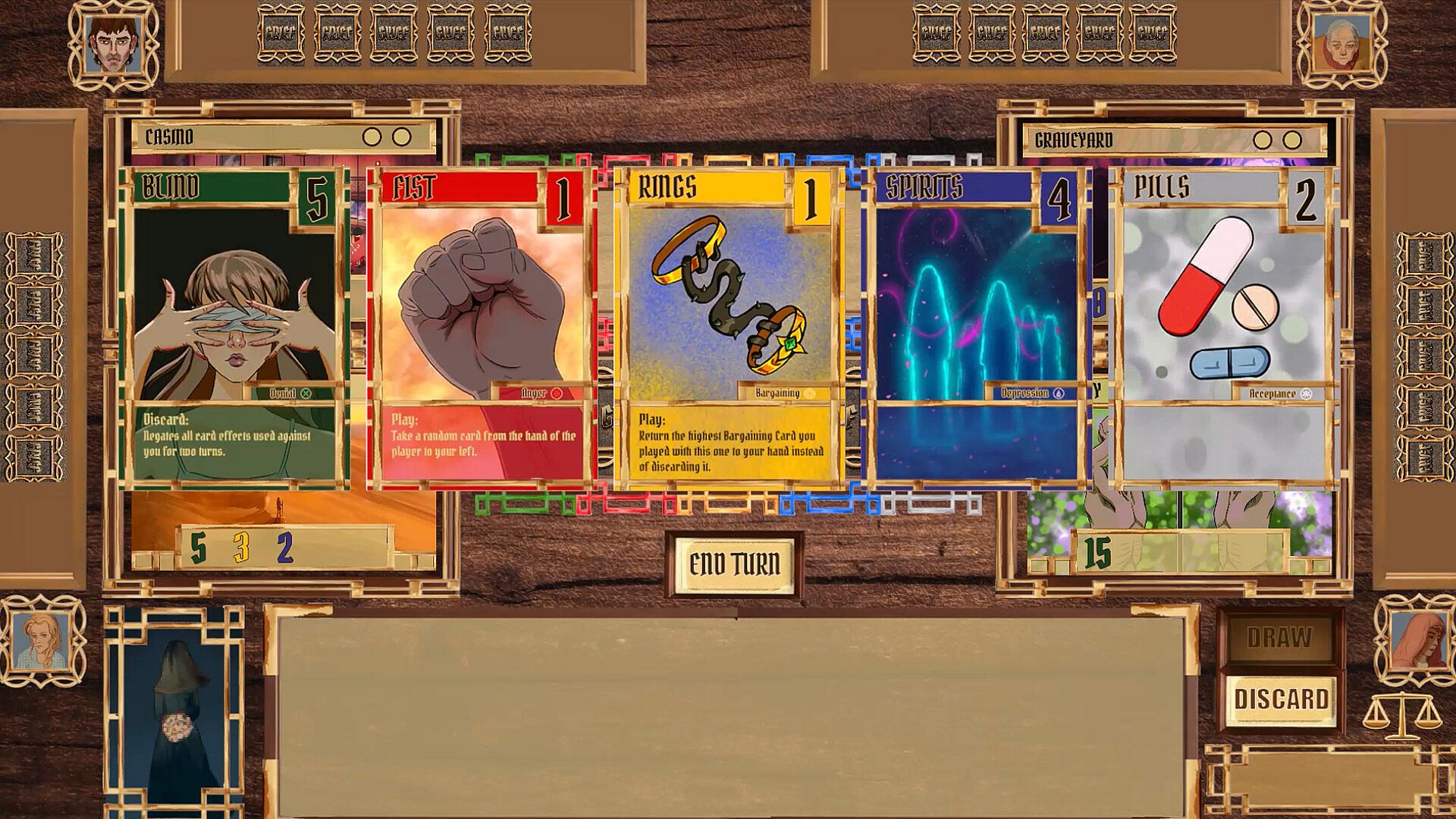 Plan your cards and actions carefully, outmaneuver your opponents, and be the first to complete all five stages of grief represented by unique Grief Tokens.