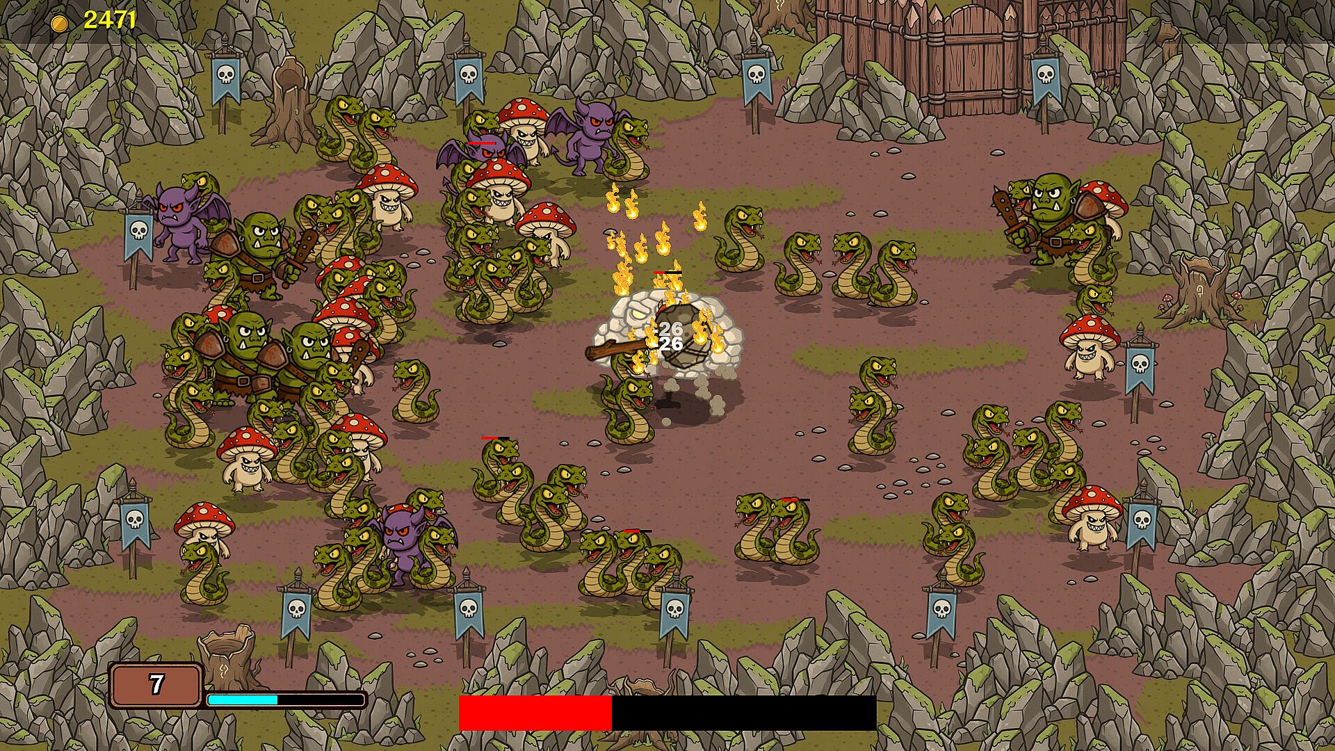 A stone golem has awoken, and you must stop him and his army of monsters. A magical artifact will aid you in this quest. Crush enemies with your hammer to earn gold, which you can use to upgrade your weapons and abilities.