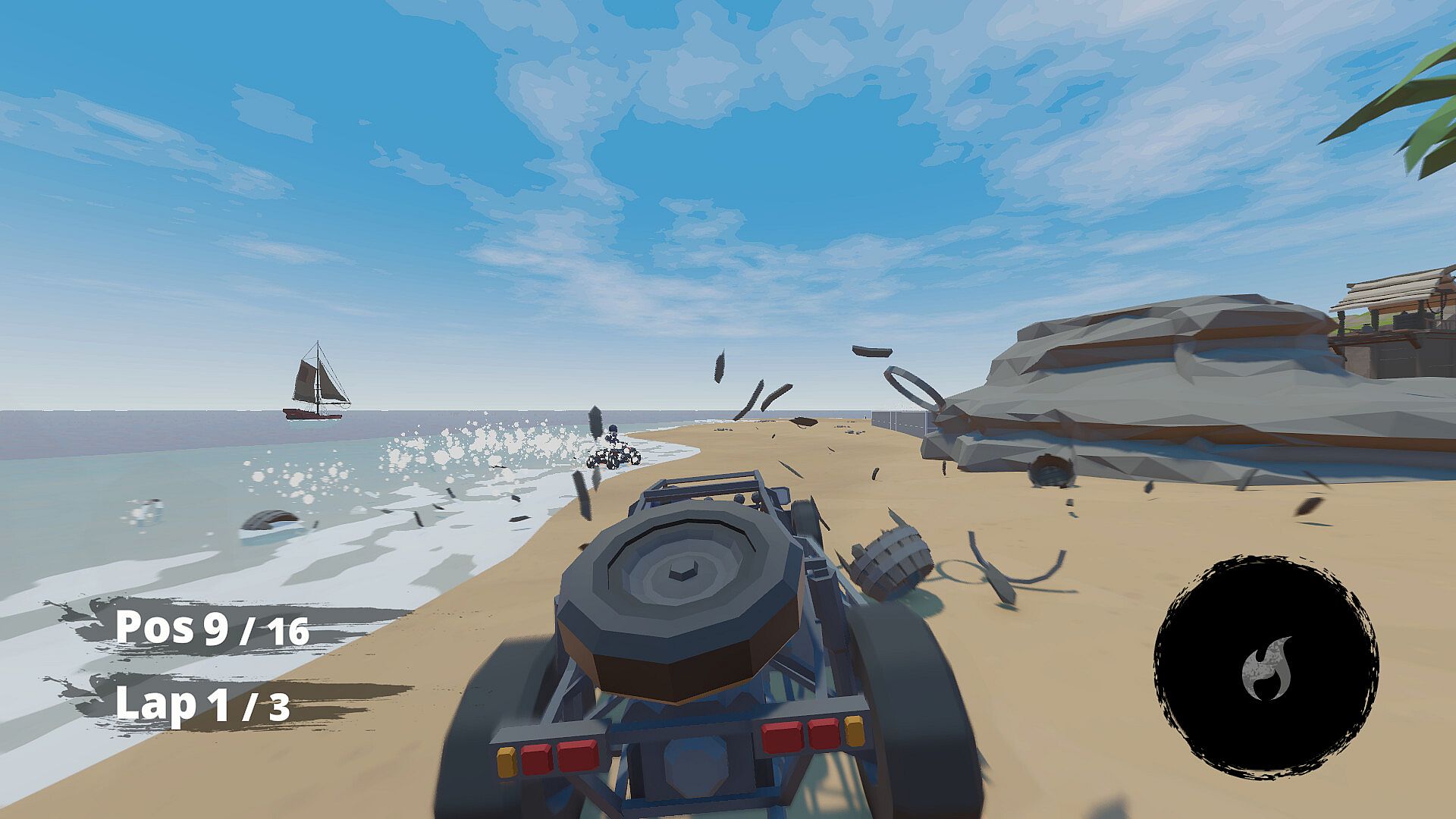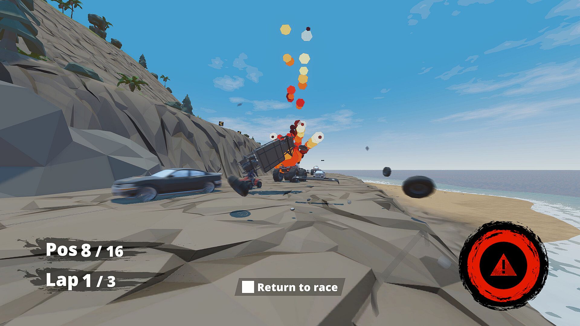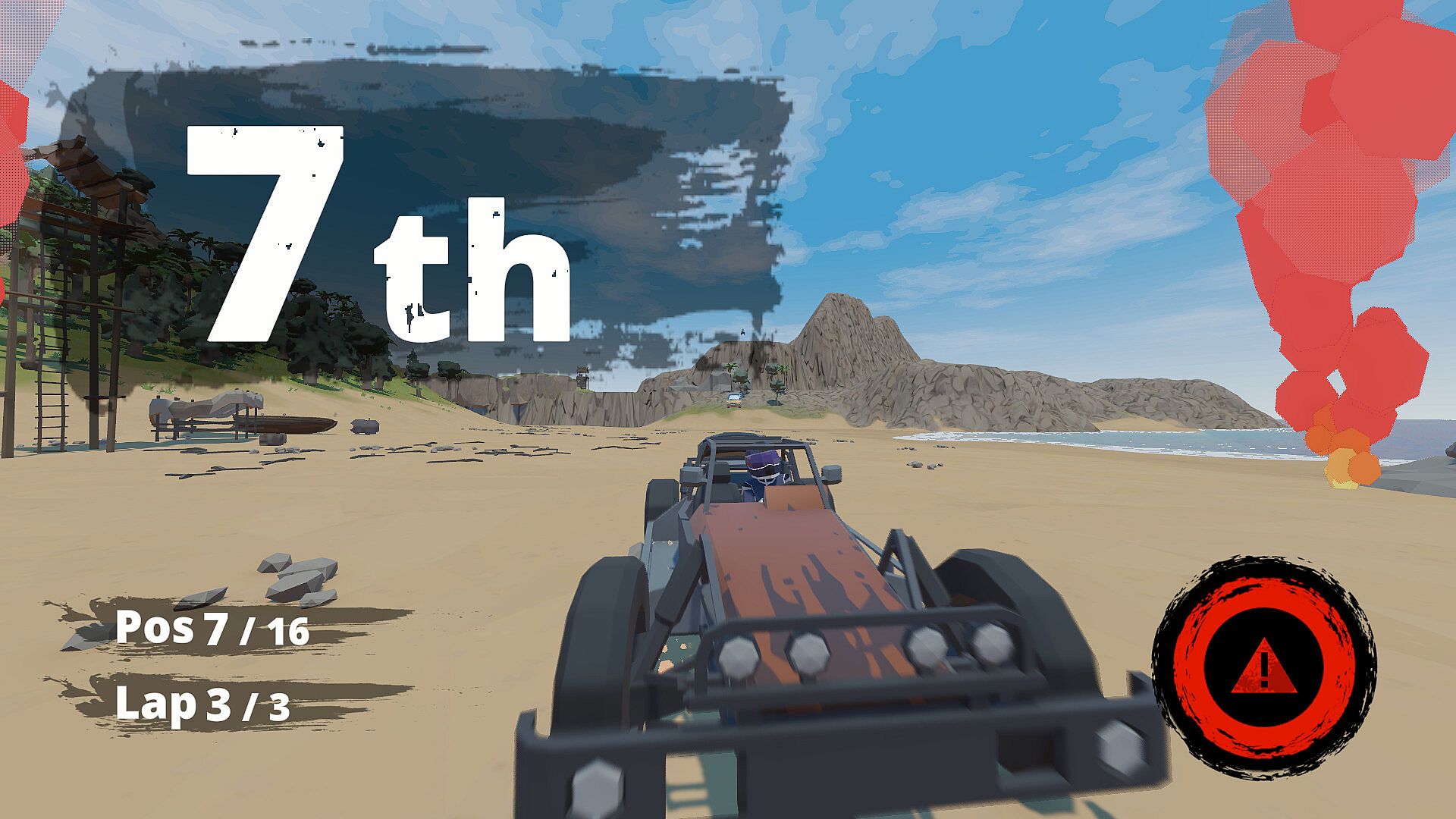 Join an intense off-road race where 16 vehicles collide! Race across six different tracks, including forests, beaches, and canyons, using four types of vehicles such as buggies and monster trucks. Destroy obstacles to find shortcuts, and eliminate rival cars to gain an advantage in the race.